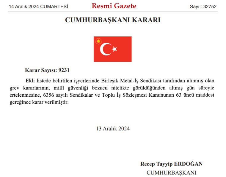 "Birleşik Metal-İş Sendikası tarafından alınmış olan grev kararlarının, milli güvenliği bozucu nitelikte görüldüğünden altmış gün süreyle ertelenmesine, 6356 sayılı Sendikalar ve Toplu İş Sözleşmesi Kanununun 63'üncü maddesi gereğince karar verilmiştir."