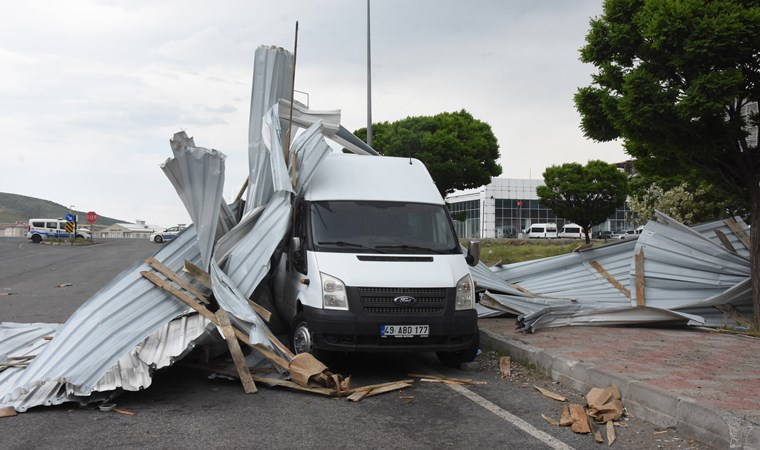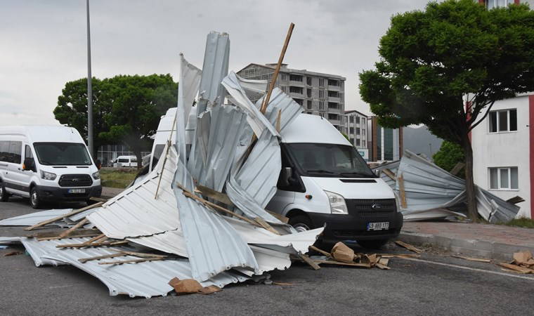 Çatılardan kopan sac ve tahta parçalarının isabet ettiği iki binanın dış cephesinde, cam balkonlar ve balkon korkulukları ile park halindeki 2 minibüste hasar meydana geldi.