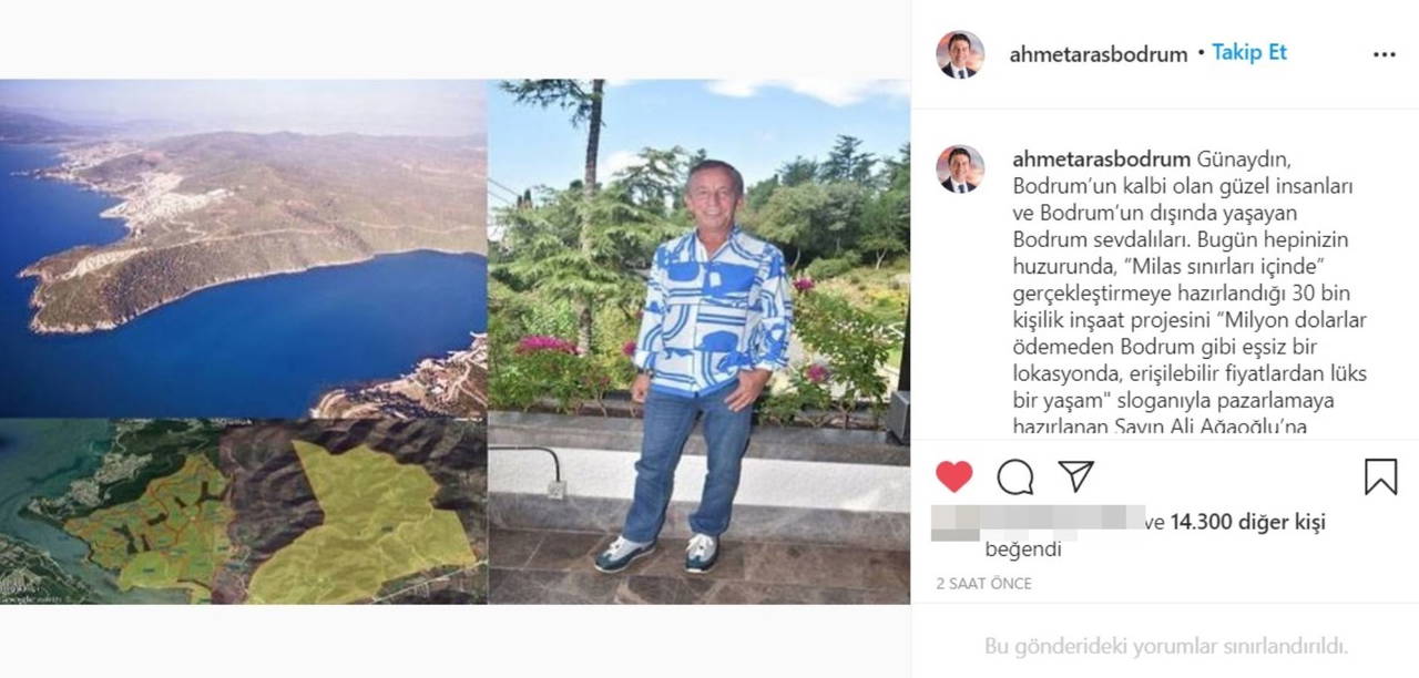 Bodrum Belediye Başkanı Ahmet Aras, sosyal medyadan yaptığı bir paylaşımla, Bodrum’da ‘Milas sınırları’ içinde bir proje hazırlığında olan iş insanı Ali Ağaoğlu’na tepki gösterdi.