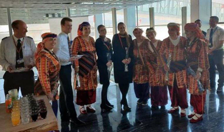 Uçak havalimanında 'su takı' gösterisiyle karşılandı. Bodrum'a gelen İngiliz yolcular için karşılama pastası kesildi. Yolcular, yerel halk oyunları ve çiçeklerle karşılandı.