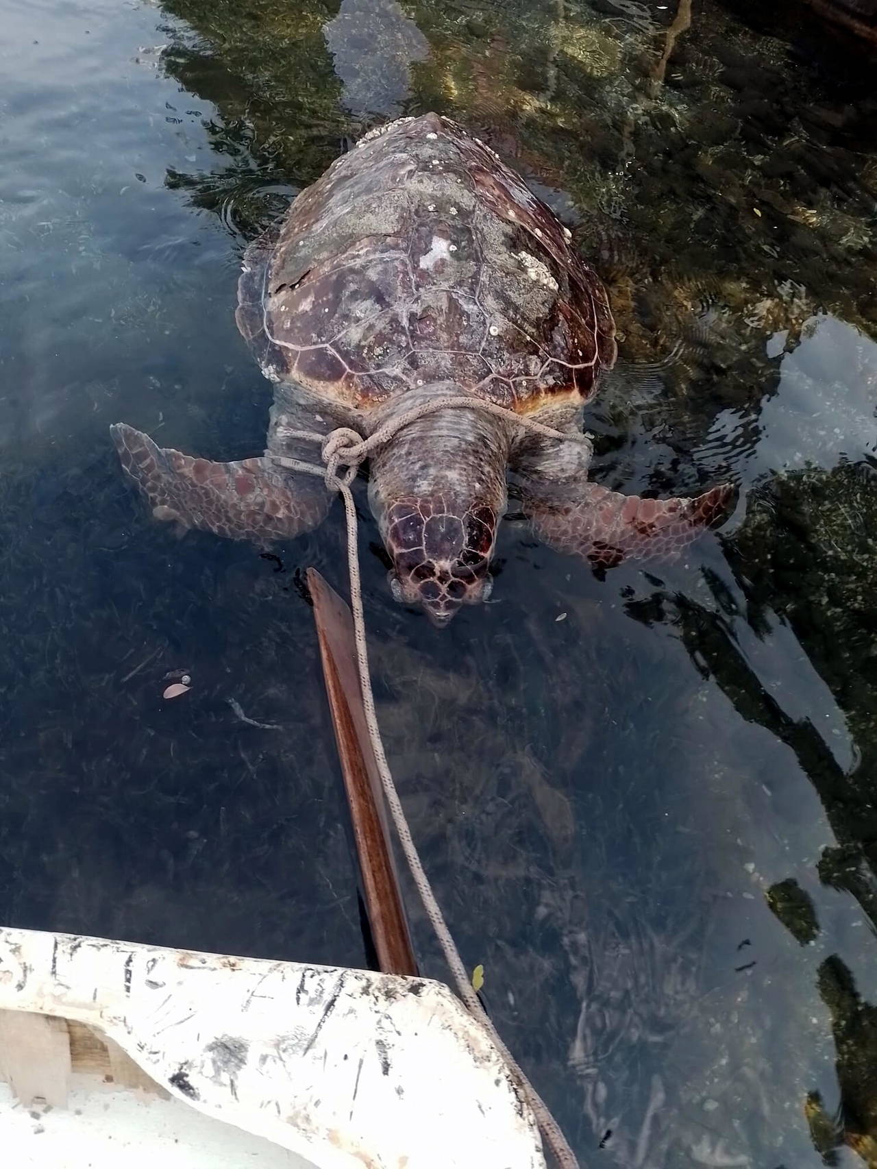 70 santimetre boyunda, yaklaşık 50 kilogram ağırlığındaki deniz kaplumbağası vinçle denizden alınarak yetkililere teslim edildi. Durum, Deniz Kaplumbağaları Araştırma, Kurtarma ve Rehabilitasyon Merkezi (DEKAMER) yetkililerine bildirildi.