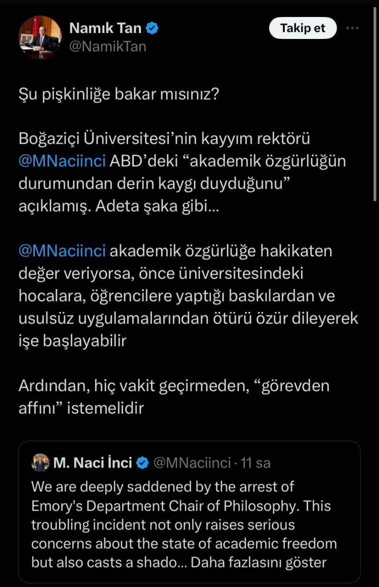 "Boğaziçi Üniversitesi’nin kayyım rektörü Naci İnci ABD’deki “akademik özgürlüğün durumundan derin kaygı duyduğunu” açıklamış. Adeta şaka gibi…