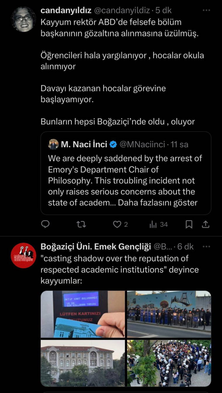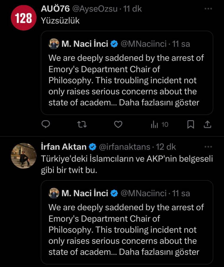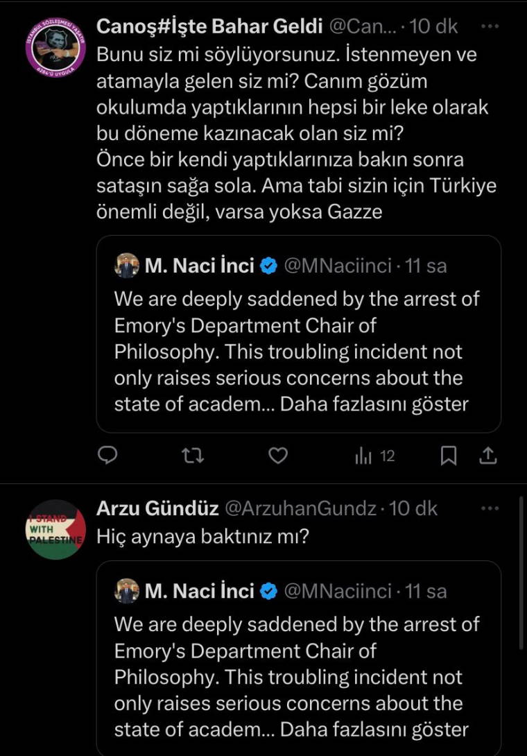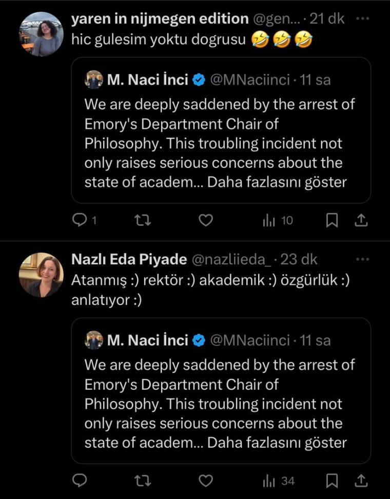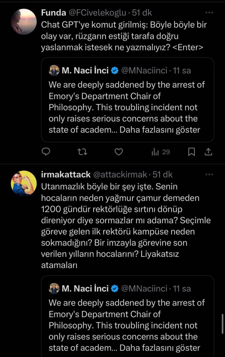 İnci, İngilizce yaptığı paylaşımında, "Emory Felsefe Bölümü Başkanının tutuklanmasından derin üzüntü duyduk. Bu sıkıntılı olay, akademik özgürlüğün durumuyla ilgili ciddi kaygılara yol açmakla kalmıyor, aynı zamanda saygın akademik kurumların itibarına da gölge düşürüyor. Gazze'deki vahşete karşı barışçıl sesler yükselten akademik camiayla dayanışma içindeyiz" ifadelerini kullandı.