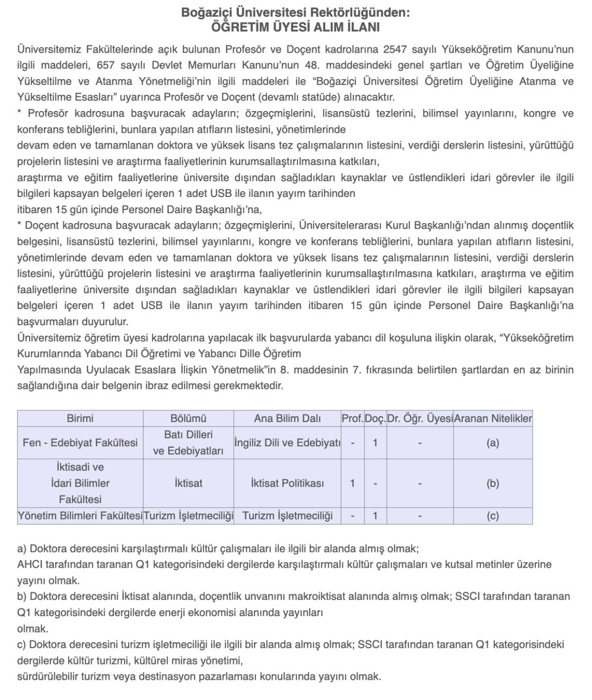 Boğaziçi Üniversitesi Batı Dilleri ve Edebiyatları Bölümü İngiliz Dili ve Edebiyatı Anabilim dalı için 17 Kasım’da doçentlik kadrosuna alınacak öğretim görevlisi için ilana çıkıldı. Söz konusu ilanda, “Doktora derecesini karşılaştırmalı kültür çalışmaları ile ilgili bir alanda almış olmak; AHCI tarafından taranan Q1 kategorisindeki dergilerde karşılaştırmalı kültür çalışmaları ve kutsal metinler üzerine yayını olmak” şartı arandı.