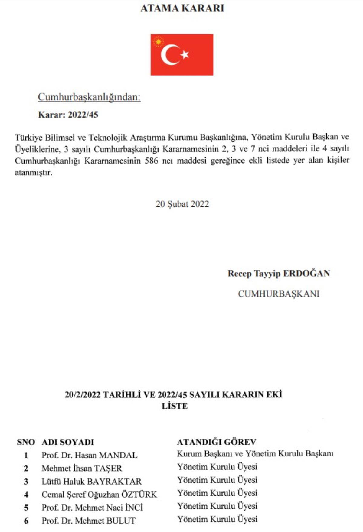 Resmi Gazete'de yayımlanan karara göre TÜBİTAK Kurum Başkanı ve Yönetim Kurulu Başkanı olarak Prof. Dr. Hasan Mandal görevine devam ederken, Yönetim Kurulu Üyeleri Mehmet İhsan Taşer, Lütfü Haluk Bayraktar, Cemal Şeref Oğuzhan Öztürk, Prof. Dr. Mehmet Bulut, Prof.Dr. Mehmet Naci İnci oldu.