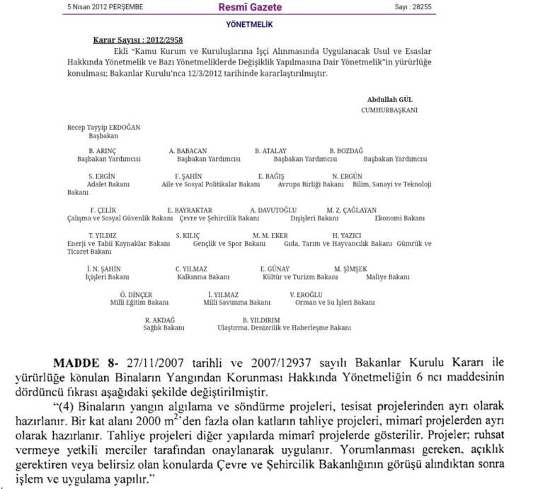 Aynı tarihlerde, Şehircilik ve Çevre Bakanlığı tarafından “Yapı kullanma izinlerinde başvuru sahibinden bilgi ve belge istenmesine ilişkin esaslar” başlığı altında hazırlanan değişiklikler, 3 Nisan 2012 tarihli Resmi Gazete’de yayınlanarak yürürlüğe sokuldu. Değişiklikte şöyle deniliyordu: