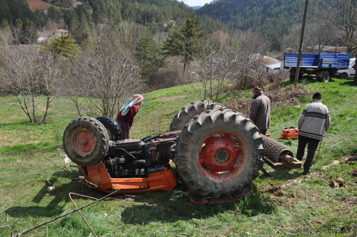 Erol Akman idaresindeki traktör, tarla yolunda sürücüsünün kontrolünden çıkarak yol kenarına devrildi. Meydana gelen kazada dede Erol Akman traktörün altında kalırken, torunu ise savruldu.