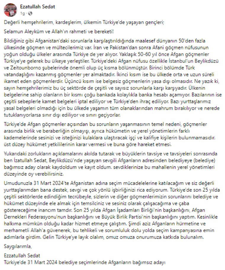 Afganistan Dernekleri Başkanı Ezatullah Sedat İstanbul Beylikdüzü’nden bağımsız olarak belediye başkan adaylığını açıkladı.