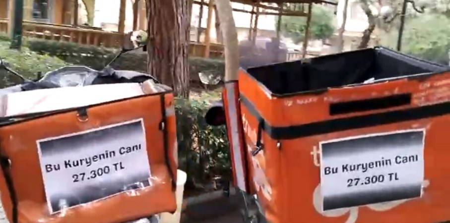 Mahmud’un sadece 27 bin 300 lira para cezası verilemesine ve son bir kaç günde yaşanan iş cinayetlerine karşı İzmir’deki motokuryeler motorlarına “Bu kuryenin canı 27300 TL” yazarak tepki gösterdi.