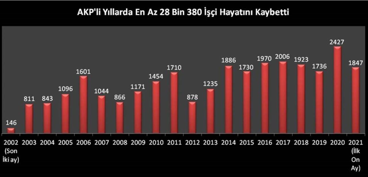 2002 yılının son iki ayında en az 146 işçi, 2003 yılında en az 811 işçi, 2004 yılında en az 843 işçi, 2005 yılında en az 1096 işçi, 2006 yılında en az 1601 işçi, 2007 yılında en az 1044 işçi, 2008 yılında en az 866 işçi, 2009 yılında en az 1171 işçi, 2010 yılında en az 1454 işçi, 2011 yılında en az 1710 işçi, 2012 yılında en az 878 işçi, 2013 yılında en az 1235 işçi, 2014 yılında en az 1886 işçi, 2015 yılında en az 1730 işçi, 2016 yılında en az 1970 işçi, 2017 yılında en az 2006 işçi, 2018 yılında en az 1923 işçi, 2019 yılında en az 1736 işçi, 2020 yılında en az 2427 işçi, 2021 yılının ilk on ayında ise en az 1847 işçi hayatını kaybetmiştir…