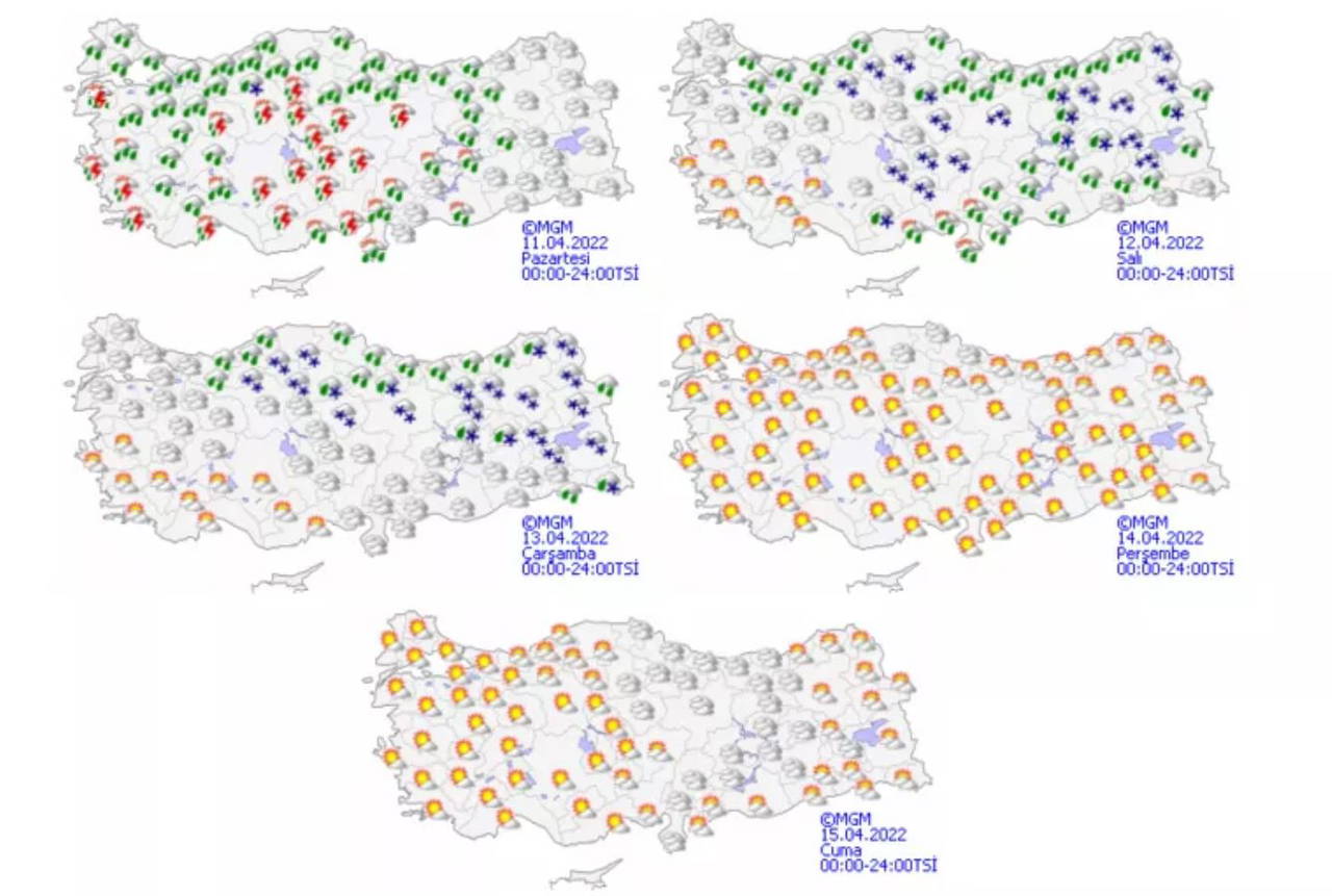 Marmara'nın güney ve doğusu, Batı Karadeniz'in batısı, Orta Karadeniz, Kastamonu, Giresun, Trabzon, Rize, Gümüşhane, Bayburt, Sivas, Erzincan, Isparta, Antalya'nın doğu kesimleri, Osmaniye ile Hatay ve Kahramanmaraş'ın batısında yerel olarak kuvvetli olacağı tahmin edilen yağışların, genellikle yağmur ve sağanak, yer yer gök gürültülü sağanak, akşam saatlerinden sonra Marmara'nın güneydoğusu, İç Ege, İç Anadolu'nun kuzeydoğusu ile Doğu Anadolu'nun kuzeyinde karla karışık yağmur ve kar şeklinde olması bekleniyor. Karadeniz'in iç ve yüksek kesimleri ile Doğu Anadolu'da yüksek kar örtüsüne sahip eğimli bölgelerde çığ riski bulunuyor.