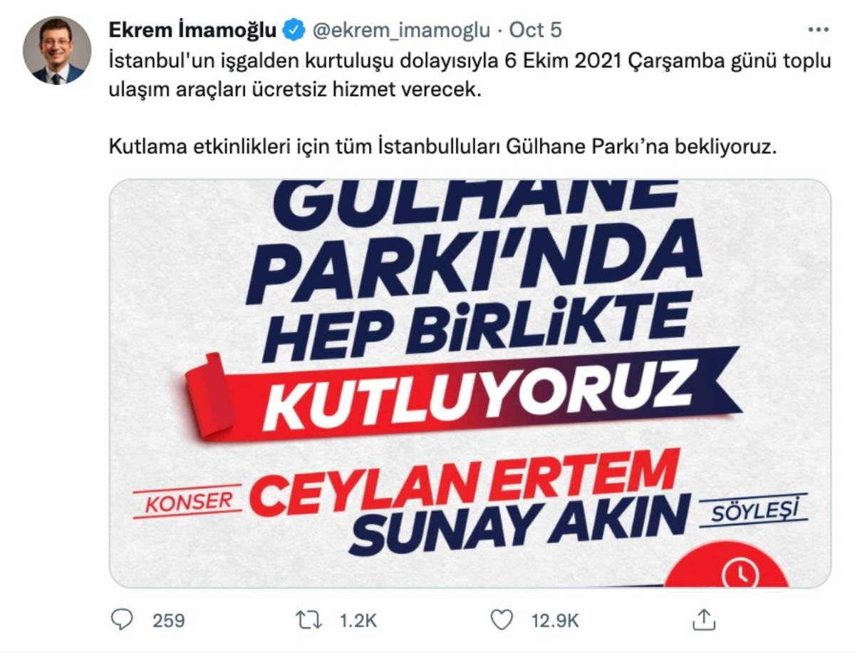 ” Kurumun resmi hesabı üzerinden, ‘İstanbul’un kurtuluşu dolayısıyla 6 Ekim 2021 Çarşamba günü toplu ulaşım araçları ücretsiz hizmet verecektir. Tüm vatandaşlarımıza iyi yolculuklar dileriz.”