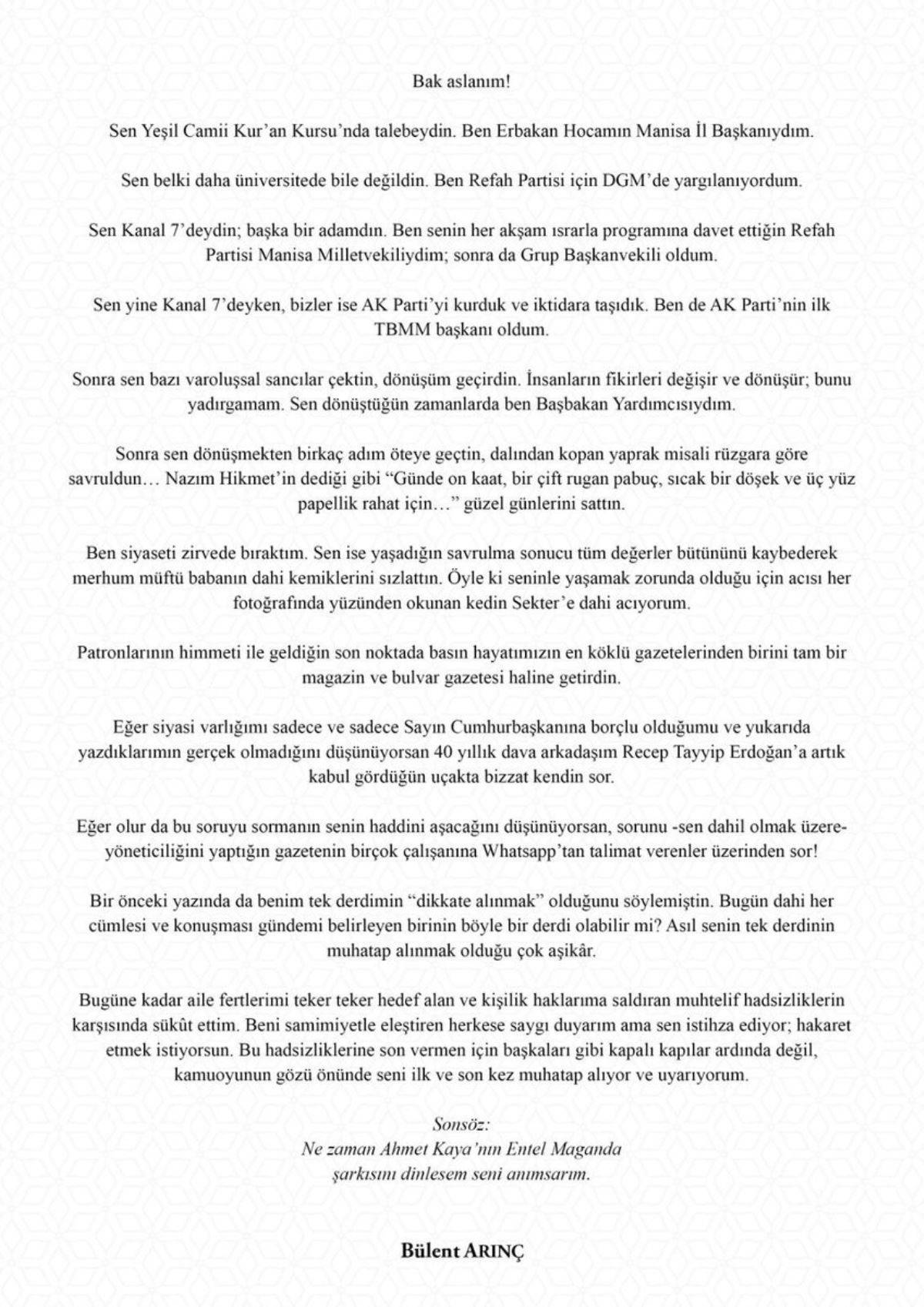 "Bak aslanım!" diyerek sözlerine başlayan Arınç, "Patronlarının himmeti ile geldiğin son noktada basın hayatımızın en köklü gazetelerinden birini tam bir magazin ve bulvar gazetesi haline getirdin. Seninle yaşamak zorunda olduğu için acısı her fotoğrafında yüzünden ookunan kedin Sekter'e dahi acıyorum" diye belirtti.