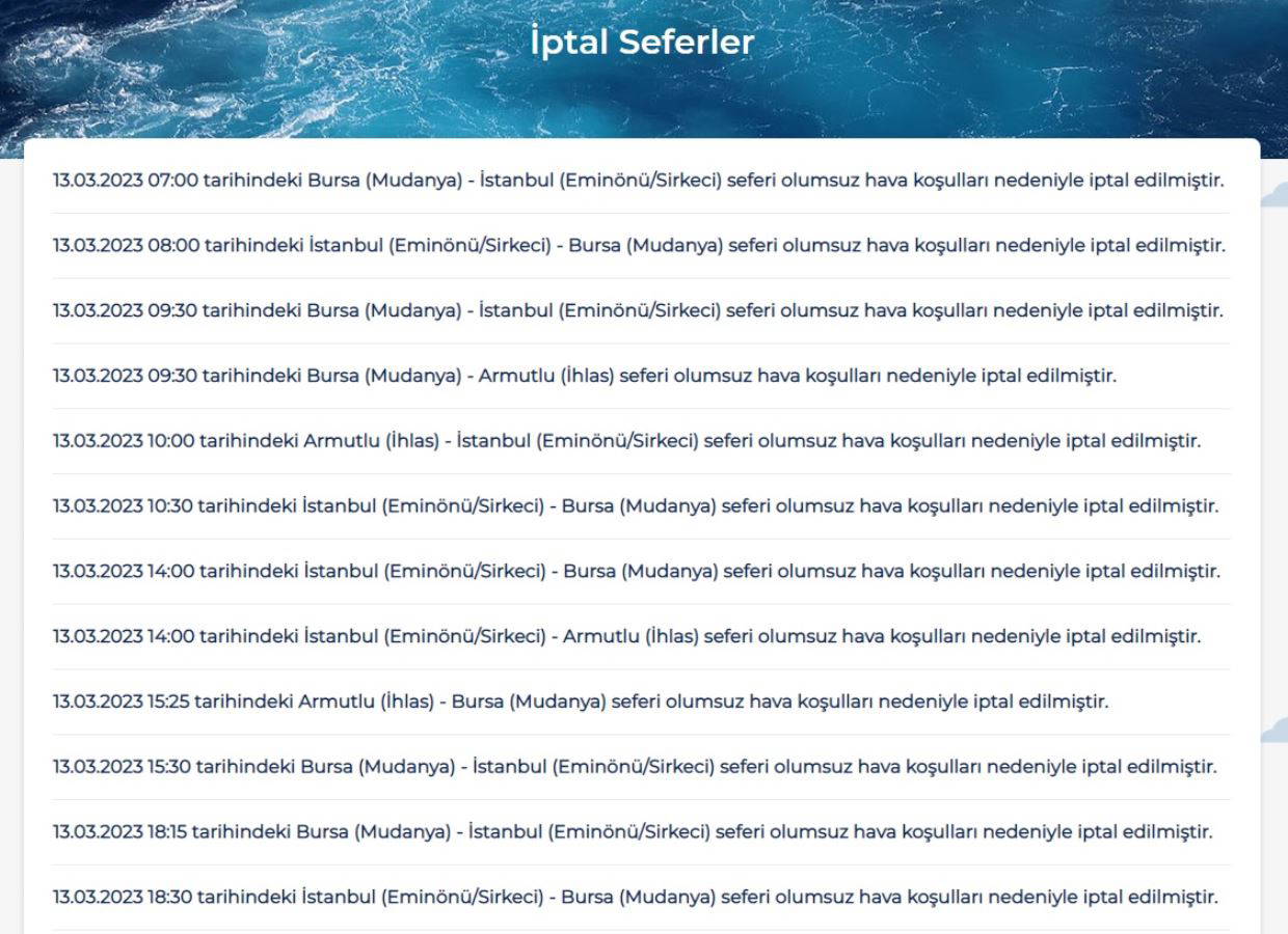 BUDO'nun internet sitesinde yer alan duyuruda, Bursa ile İstanbul arasında 07.00 ila 18.30 saatleri arasındaki 12 deniz otobüsü seferinin iptal edildiği bildirildi.