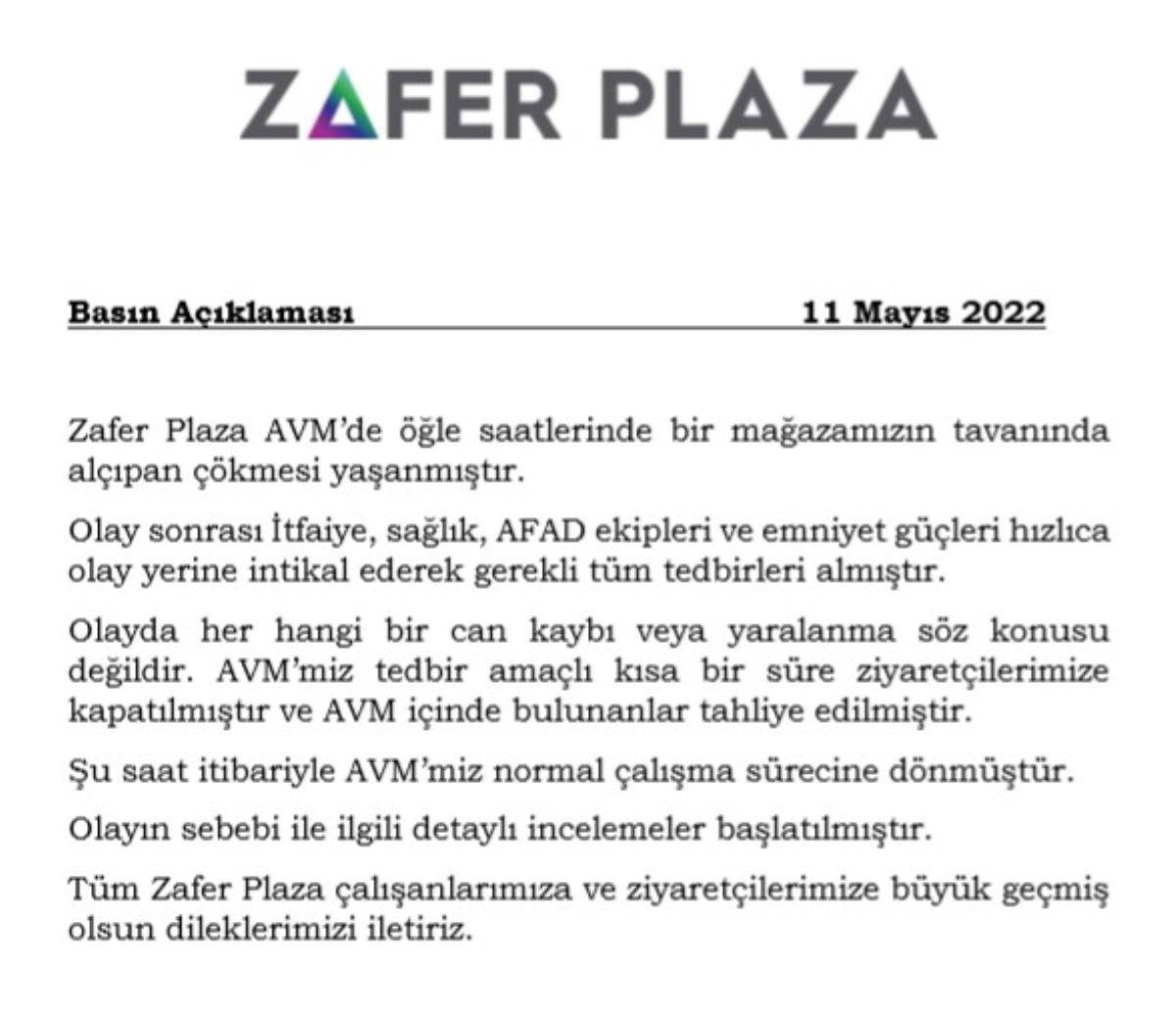 "Zafer Plaza AVM'de öğle saatlerinde bir mağazamızın tavanında alçıpan çökmesi yaşanmıştır. Olay sonrası itfaiye, sağlık, AFAD ekipleri ve emniyet güçleri hızlıca olay yerine intikal ederek gerekli tüm tedbirleri almıştır. Olayda herhangi bir can kaybı veya yaralanma söz konusu değildir. AVM'miz tedbir amaçlı kısa bir süre ziyaretçilerimize kapatılmıştır ve AVM içinde bulunanlar tahliye edilmiştir. Şu saat itibarıyla AVM'miz normal çalışma sürecine dönmüştür. Olayın sebebiyle ilgili detaylı incelemeler başlatılmıştır."