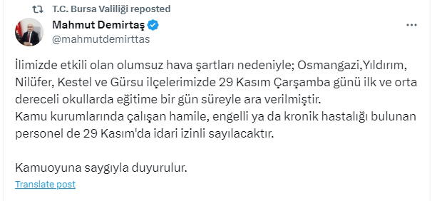 Demirtaş açıklamasında, "İlimizde etkili olan olumsuz hava şartları nedeniyle; Osmangazi, Yıldırım, Nilüfer, Kestel ve Gürsu ilçelerimizde 29 Kasım Çarşamba günü ilk ve orta dereceli okullarda eğitime bir gün süreyle ara verilmiştir. Kamu kurumlarında çalışan hamile, engelli ya da kronik hastalığı bulunan personel de 29 Kasım'da idari izinli sayılacaktır. Kamuoyuna saygıyla duyurulur" dedi.