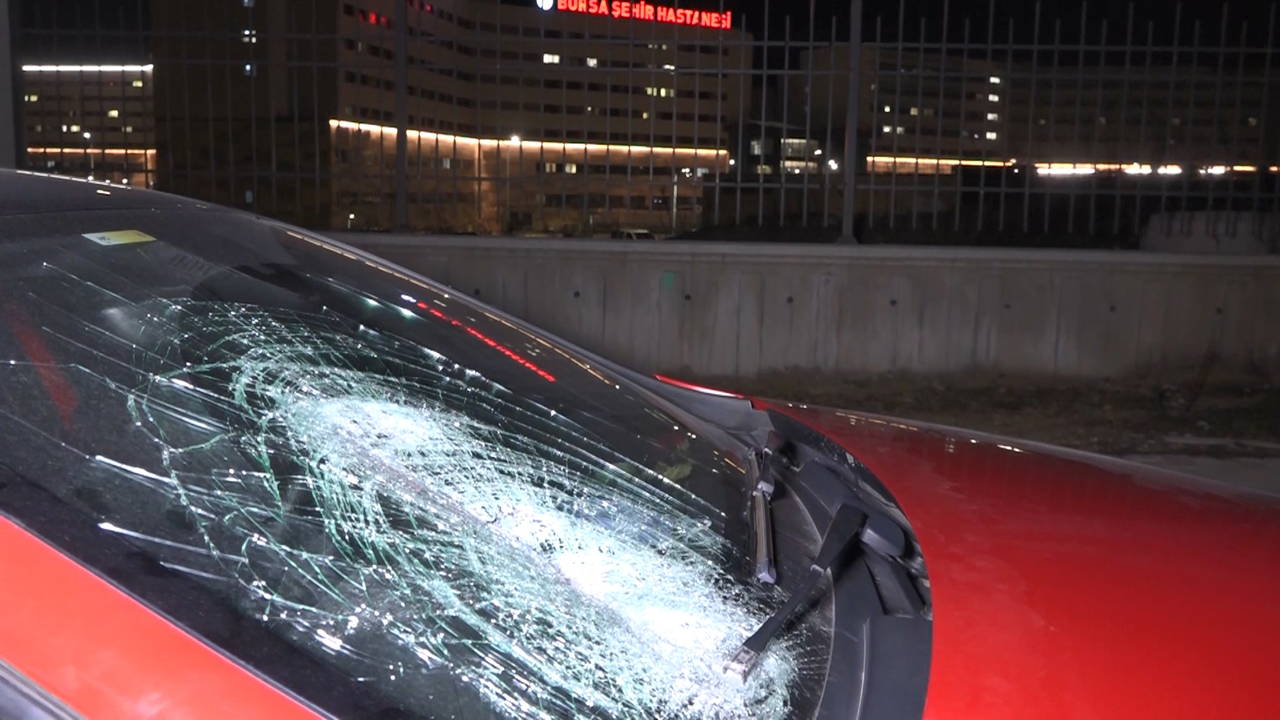 Şüphelilerin kaçarken kullandığı iddia edilen otomobil, Bursa Şehir Hastanesi'nin girişinde park halinde ve ön camı kırık halde bulundu.