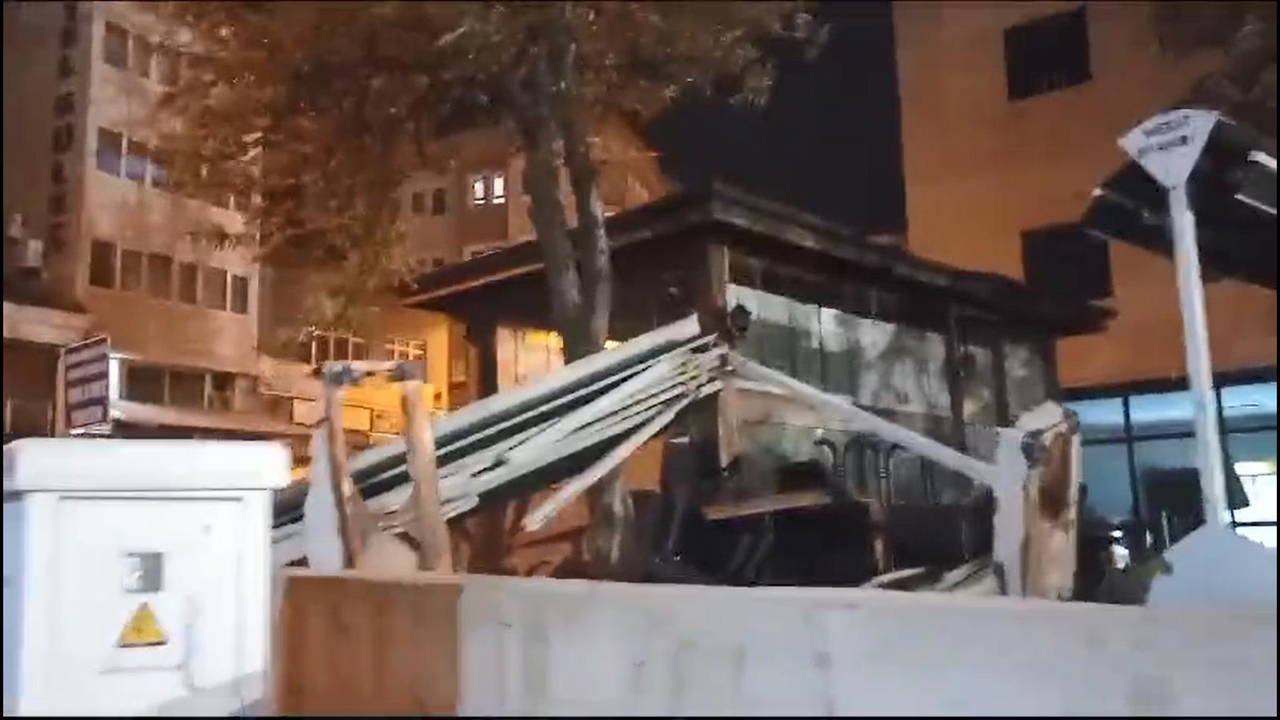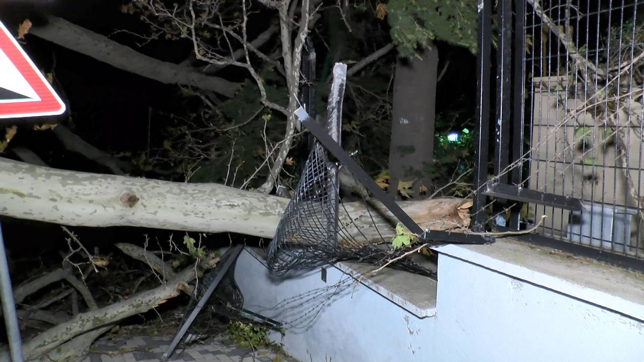 Asırlık çınar ağacının dalları yolun karşısındaki bir iş yerinin demir korkuluklarına hasar verdi. İhbarla bölgeye polis ve itfaiye ekipleri sevk edilirken, tedbir alan ekipler ağacın dallarına keserek yoldan kaldırdı.