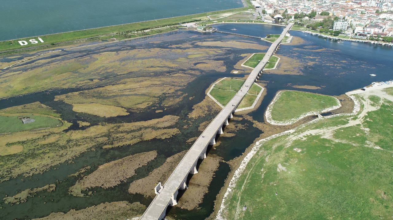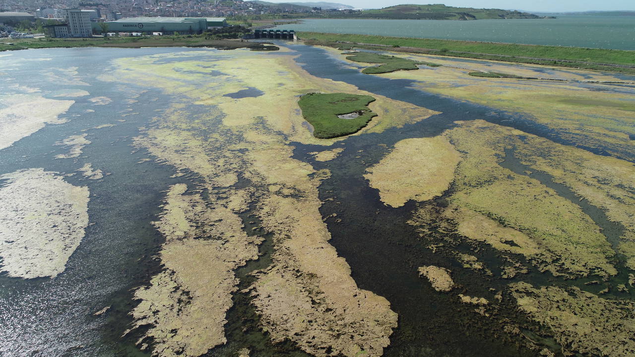 Hava sıcaklıklarının artması ve etkisini kaybetmeyen rüzgar nedeniyle Büyükçekmece Gölü'nün Marmara Denizi ile birleştiği bölgede suyun yüzeyinin yosunla örtüldüğü görüntüler dikkat çekti.