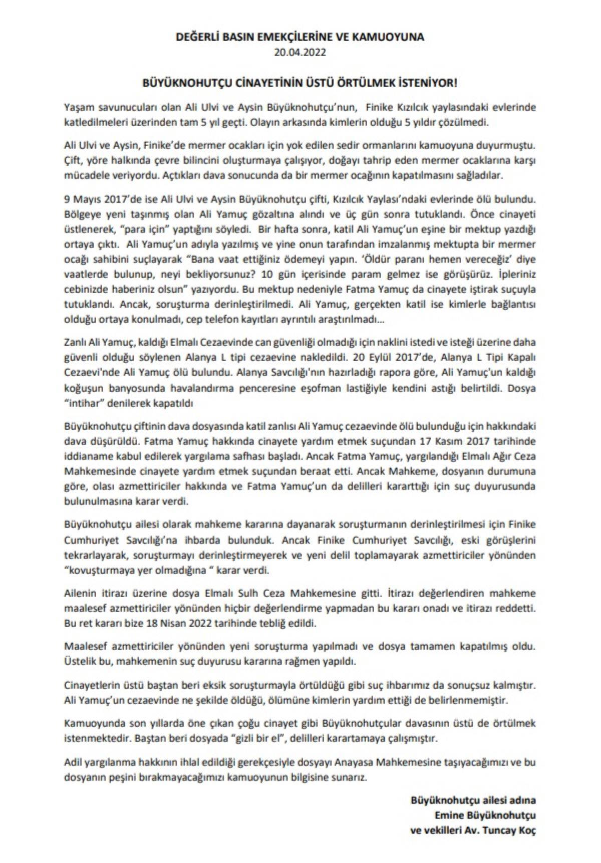 Söz konusu kararın kendilerine 18 Nisan 2022 tarihinde tebliğ edildiğini söyleyen Büyüknohutçu ailesi adına Emine Büyüknohutçu ve vekilleri Av. Tuncay Koç ise yaptıkları açıklamada Büyüknohutçular davasının üstünün örtülmek istendiğini belirtti.