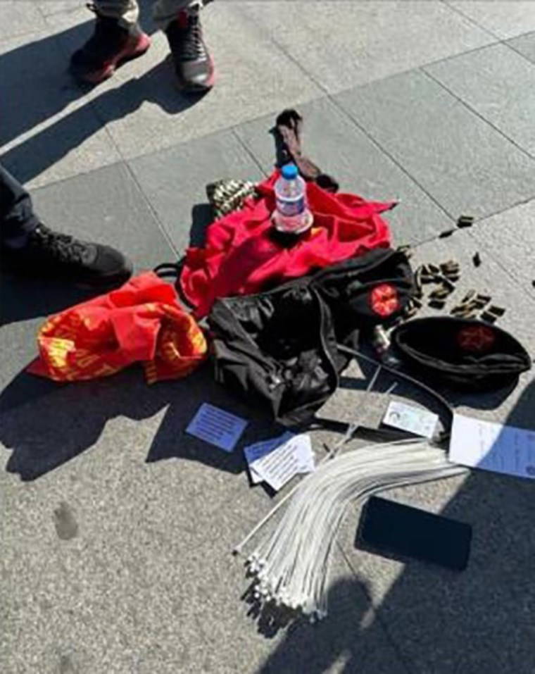 Çantadan çıkan çok sayıda mermi, çok sayıdaki plastik kelepçe ve biber gazının bulunduğu fotoğraf paylaşıldı.