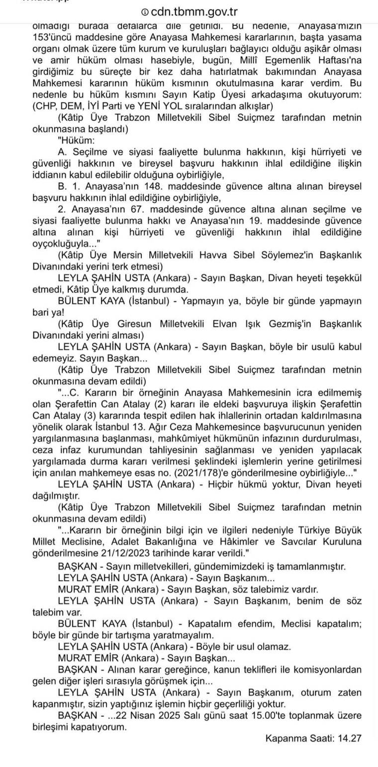 Yeni gelişmeyi paylaşan TİP İstanbul Milletvekili Sera Kadıgil, kararın açıklandığı TBMM diyaloglarının sisteme yeniden yüklendiğini açıkladı. Kadıgil, "Can Atalay’la ilgili AYM Kararının okunduğu fasıl 6 saatin ardından nihayet tekrar sisteme yüklendi. Teşekkürler. Zahmet verdik" dedi.