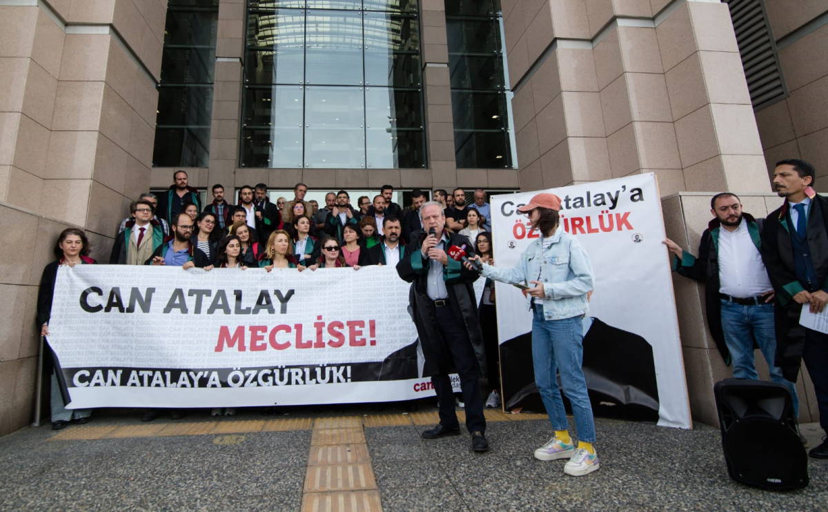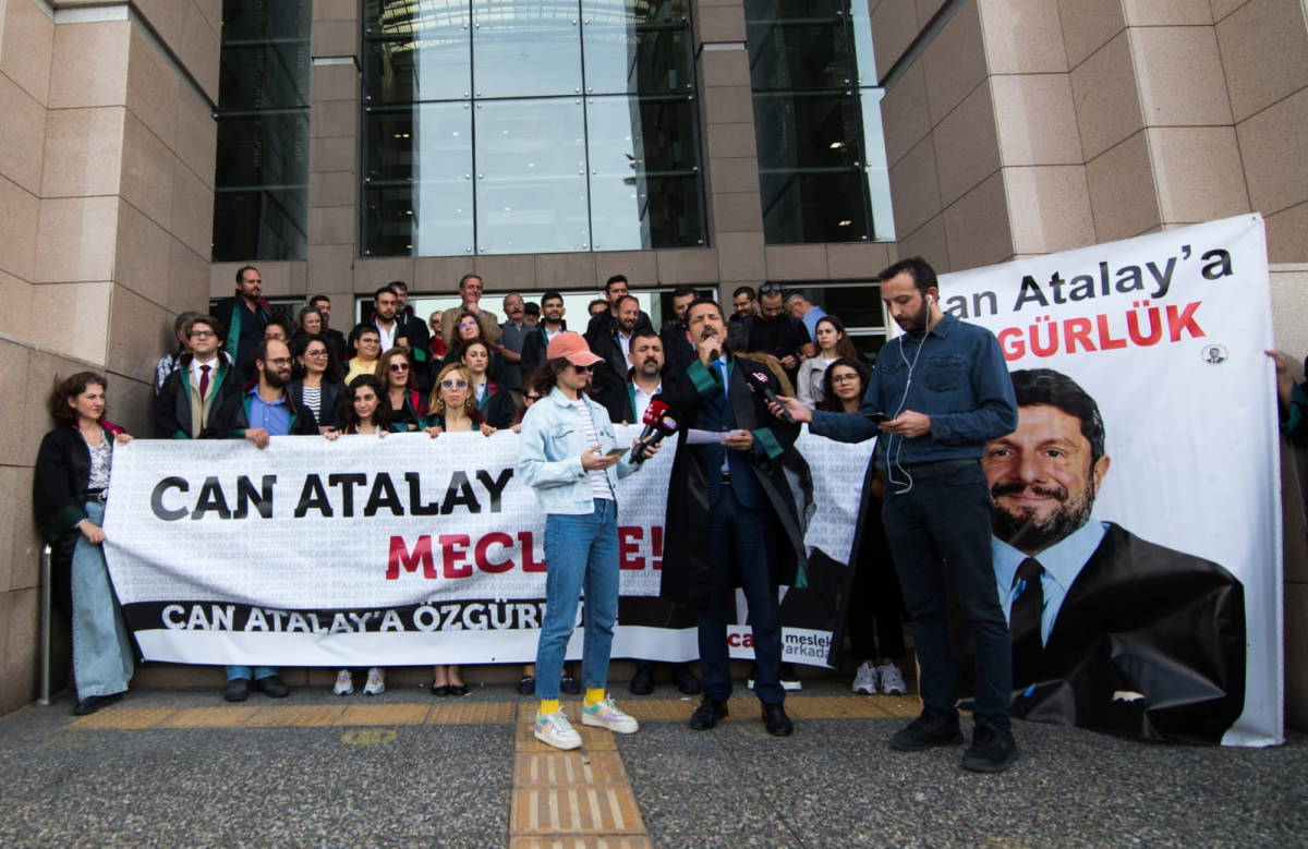 Atalay'ın arkadaşları ve meslektaşları “Can Atalay’a özgürlük” sloganları atarken, 13. Ağır Ceza Mahkemesi’nin Atalay hakkında bir an önce karar vermesi gerektiğini belirtti.