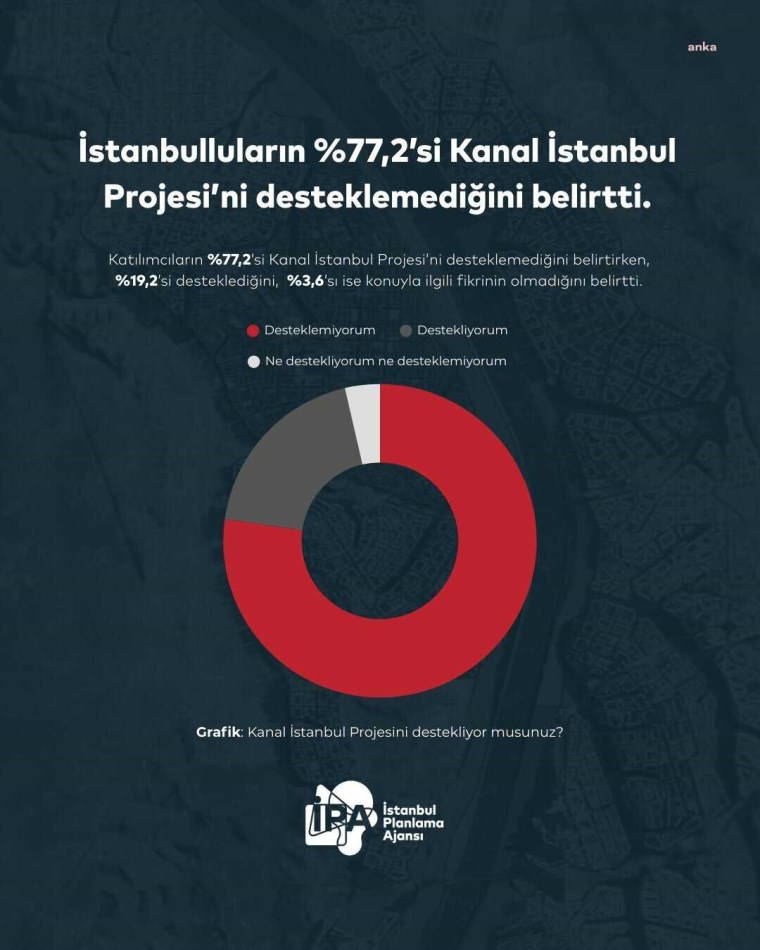 İstanbul Büyükşehir Belediyesi’ne (İBB) bağlı İstanbul Planlama Ajansı’nın (İPA) sosyal medya hesabından yapılan açıklamada, Kanal İstanbul ile ilgili İstanbullulardan görüş alındığı ve yüzde 77.2’sinin Kanal İstanbul Projesi’ni desteklemediğini açıkladı.
