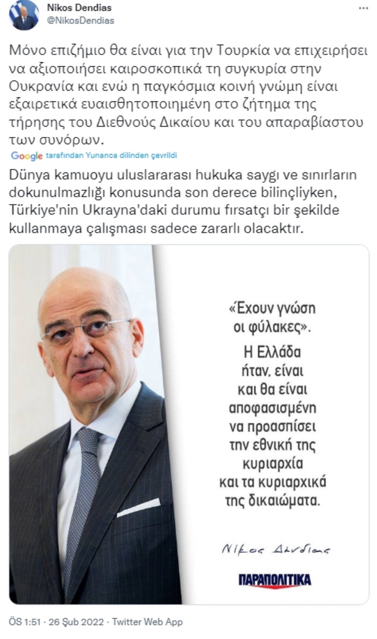 Nikos Dendias'ın "Dünya kamuoyu uluslararası hukuka saygı ve sınırların dokunulmazlığı konusunda son derece bilinçliyken, Türkiye'nin Ukrayna'daki durumu fırsatçı bir şekilde kullanmaya çalışması sadece zararlı olacaktır" şeklindeki sözlerine Twitter üzerinden yanıt veren Çavuşoğlu, "Böylesi bir saçmalık konusunda çok fazla adanmışlık ve çaba ortaya konuluyor. Çok üzücü!" yanıtını verdi.