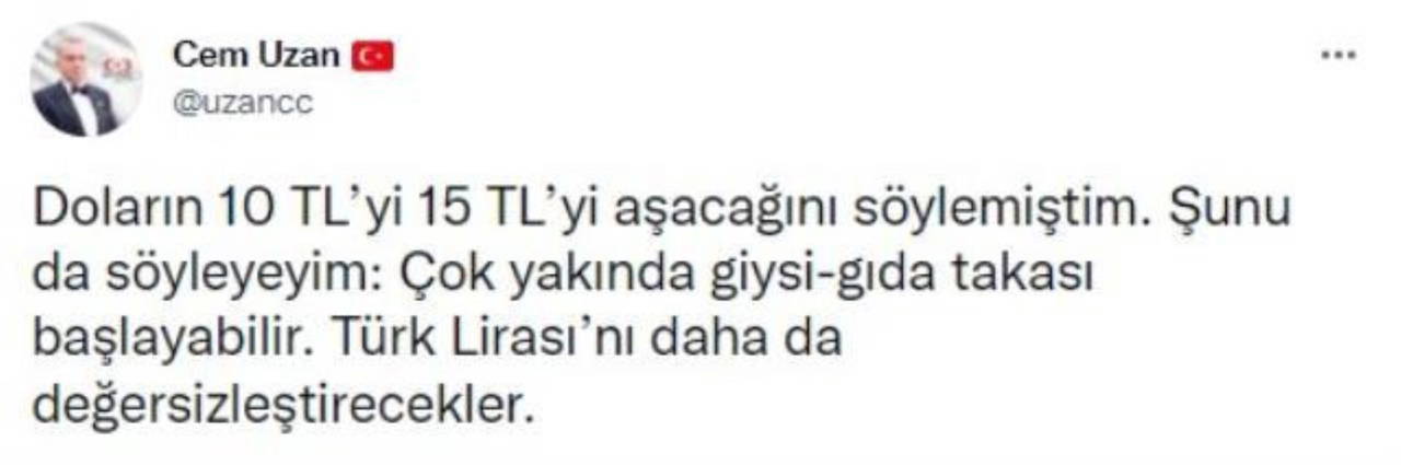 Türkiye'deki mal varlıklarına ve şirketlerine el konulmasının ardından yurt dışına çıkan ve uzun yıllardır Fransa'da yaşayan iş insanı Cem Uzan, sosyal medya platformu Twitter'daki hesabı üzerinden 'ın döviz kurundaki yükselişle ilgili tedirgin edici bir değerlendirmede bulundu.