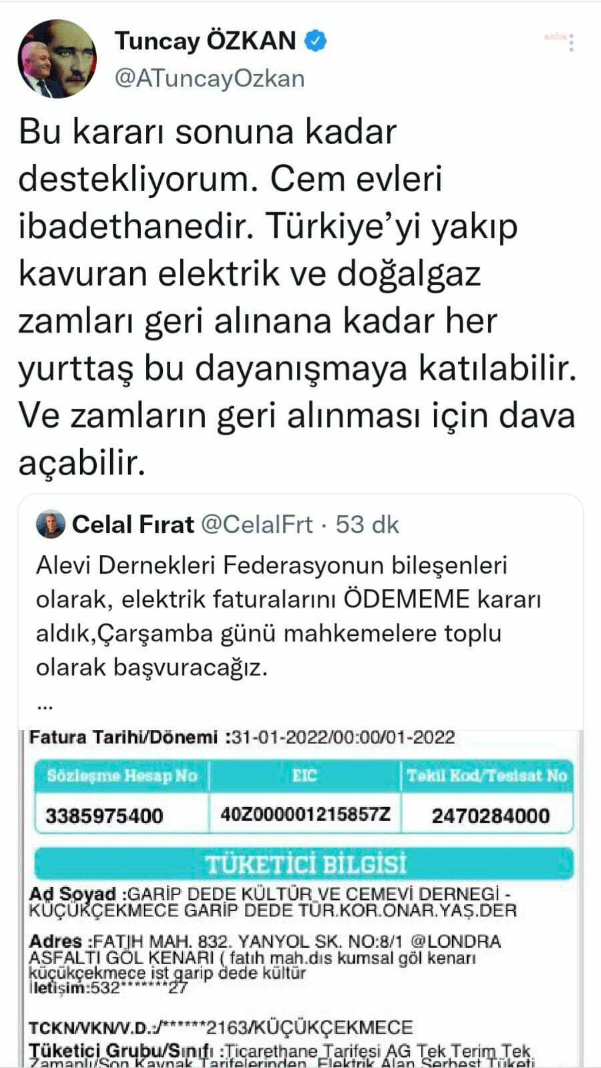 Öte yandan, CHP Genel Başkan Başdanışmanı Tuncay Özkan da sosyal medya hesabından yaptığı paylaşımda, "Bu kararı sonuna kadar destekliyorum. Cemevleri ibadethanedir. Türkiye’yi yakıp kavuran elektrik ve doğal gaz zamları geri alınana kadar her yurttaş bu dayanışmaya katılabilir. Ve zamların geri alınması için dava açabilir" dedi.