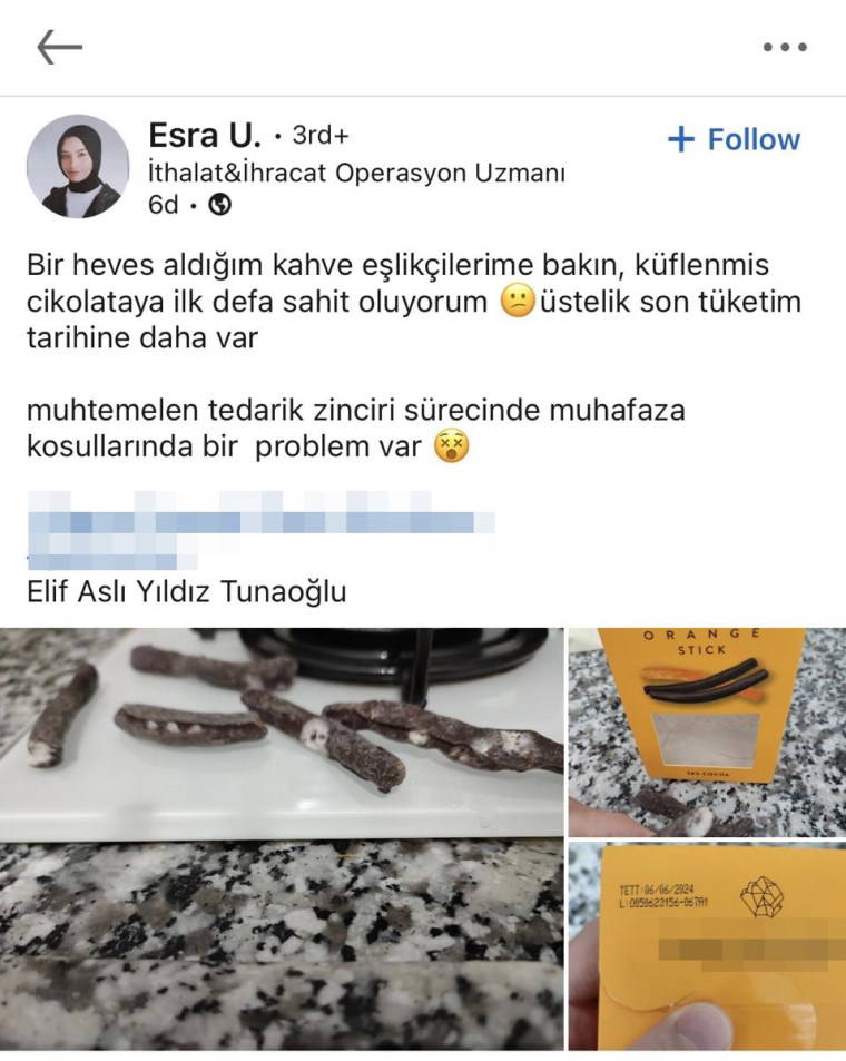 Sosyal medya ağı Linkedin’de bir kullanıcı, ünlü bir üreticiden aldığı çikolataların küflendiğine ilişkin fotoğrafları paylaşarak, “Küflenmiş çikolataya ilk defa şahit oluyorum. Üstelik son tüketim tarihine daha var. Muhtemelen tedarik zinciri sürecinde muhafaza koşullarında bir sorun var” diye yazdı.