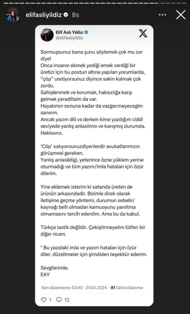 Bu paylaşımına söz konusu çikolata markasının yönetim kurulu başkanı olan Elif Aslı Yıldız Tunaoğlu’nu da etiketledi. Tunaoğlu’nun yanıtı ise tepki çekti.
