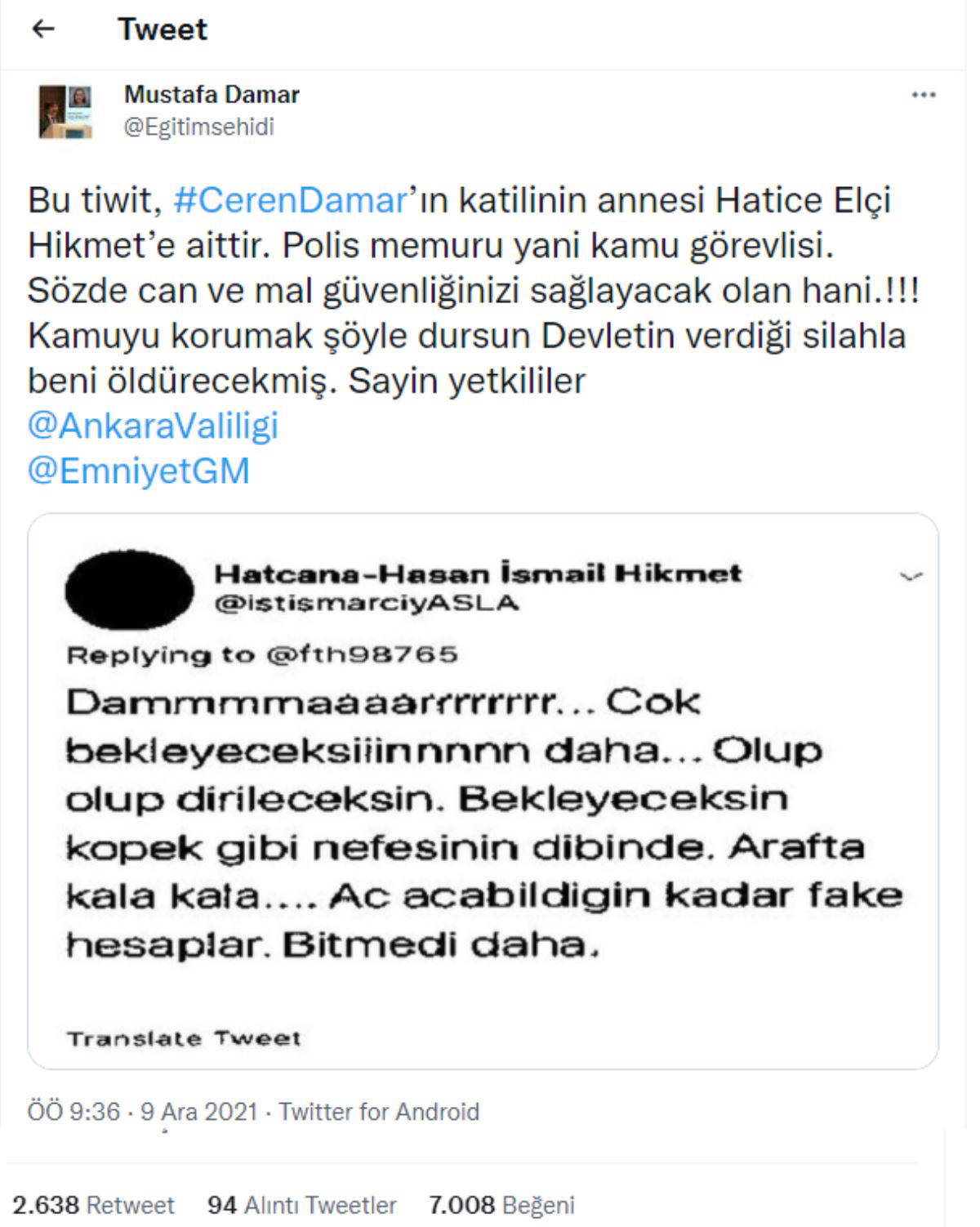 “Hatcana- Hasan İsmail Hikmet” adlı hesaptan yapılan, “Damar çok bekleyeceksin daha. Ölüp ölüp dirileceksin. Bekleyeceksin köpek gibi nefesin dibinde. Arafta kala kala… Aç açabildiğin kadar fake hesaplar. Bitmedi daha” paylaşımı bir süre sonra silindi. Paylaşımın ekran görüntüsünü paylaşan Mustafa Damar, "Bu tiwit, Ceren Damar’ın katilinin annesi Hatice Elçi Hikmet’e aittir. Polis memuru yani kamu görevlisi. Sözde can ve mal güvenliğinizi sağlayacak olan hani.!!! Kamuyu korumak şöyle dursun Devletin verdiği silahla beni öldürecekmiş. Sayin yetkililer" diyerek tepki gösterdi.
