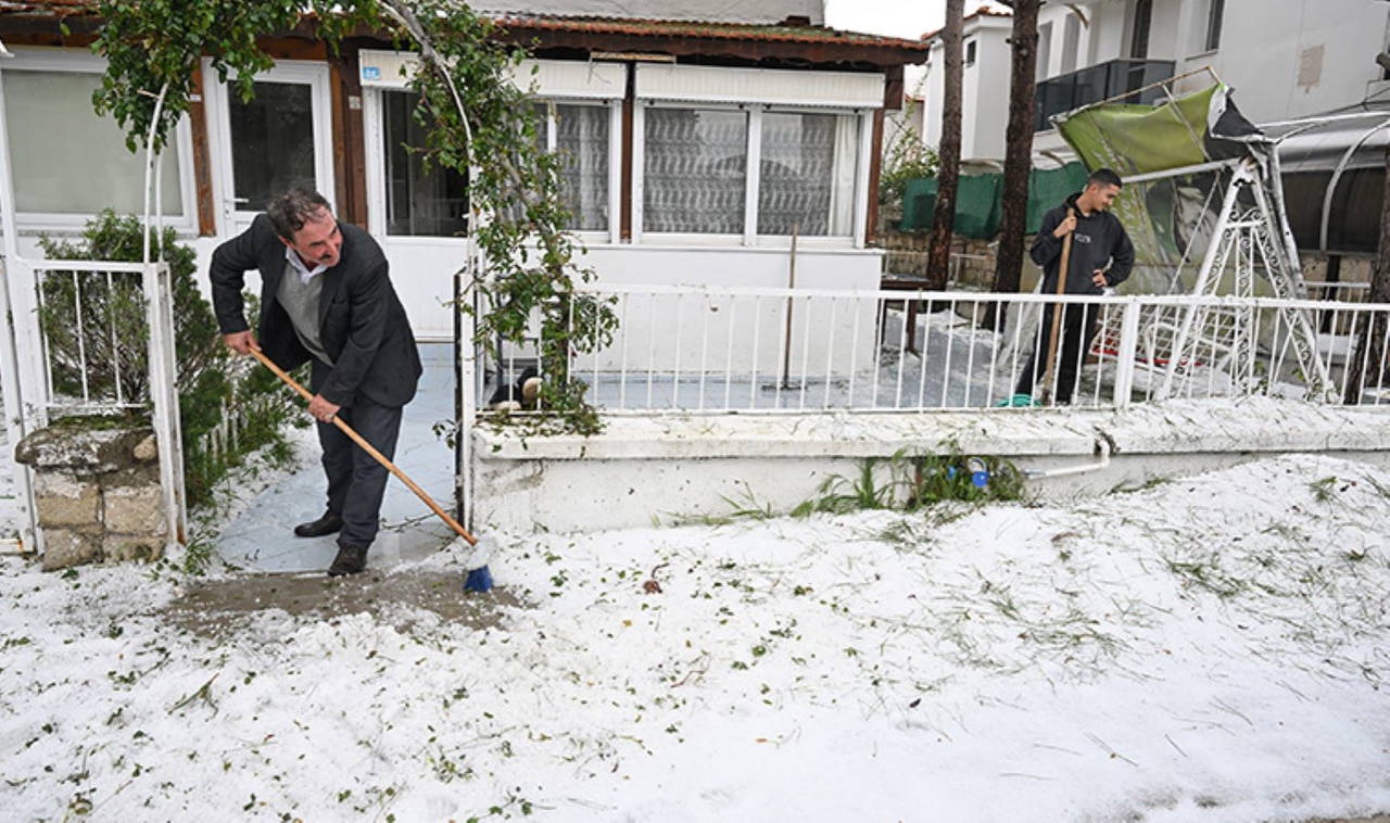 Bahçesindeki dolu yığınlarını temizleyen Aydın Kayserilioğlu, ilk kez bu kadar dolu yağdığını gördüğünü söyledi.