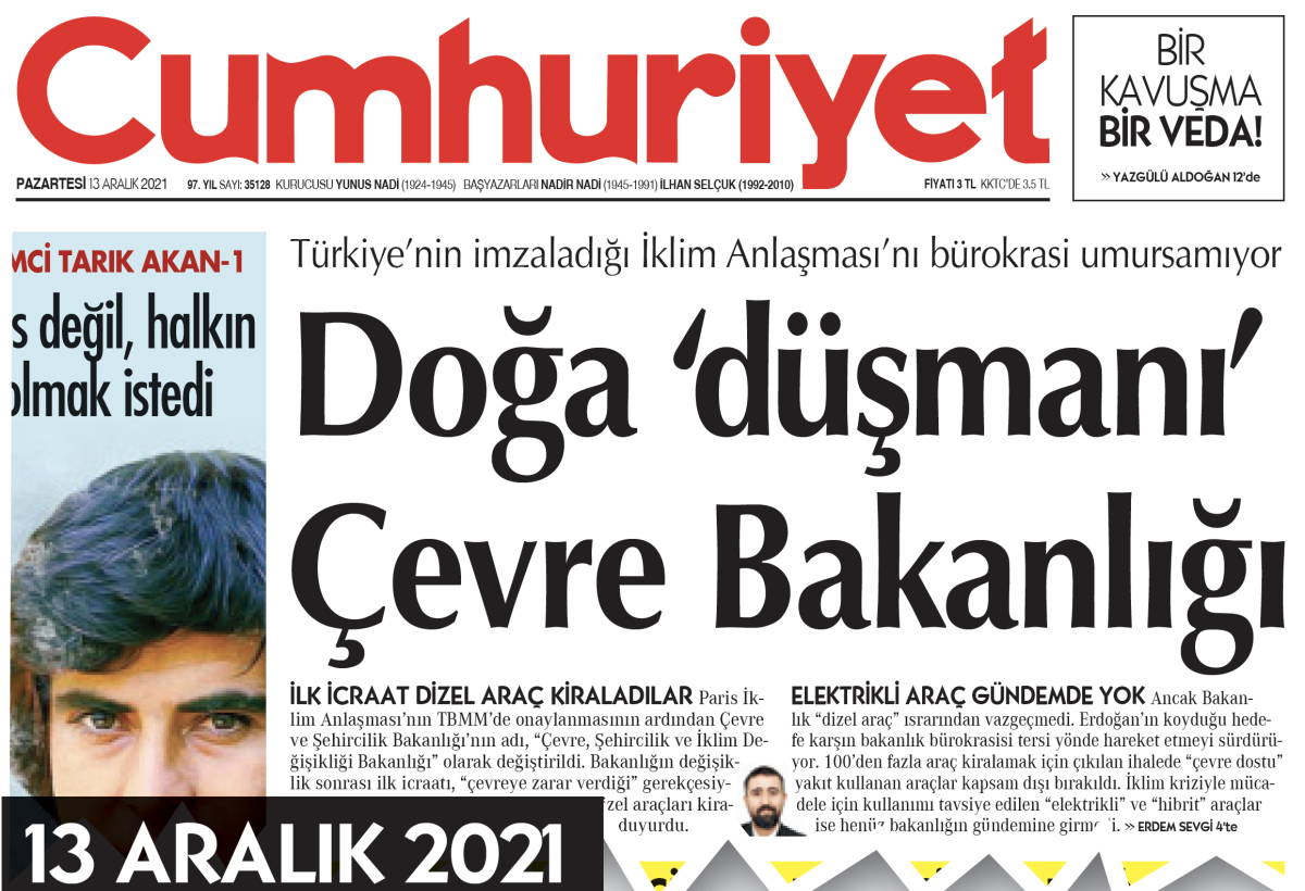 Cumhuriyet, Aralık 2021’de “Doğa düşmanı” Çevre Bakanlığı” manşetiyle bakanlığa bağlı il müdürlüklerinin yüzlerce araç kiralamak için açtığı ihalelerde “çevre dostu” araçları kapsam dışı bıraktığını gündeme getirdi. Bakanlığın Şubat 2021’de hibrit araç kiralamak için çıktığı ihalede “sadece Formula1 araçlarında bulunan özelliklerin” şart koşulduğunu ve bu nedenle kimsenin ihaleye katılamadığını Cumhuriyet, “Bakanlıktan yarış arabası ihalesi” manşetiyle duyurdu.