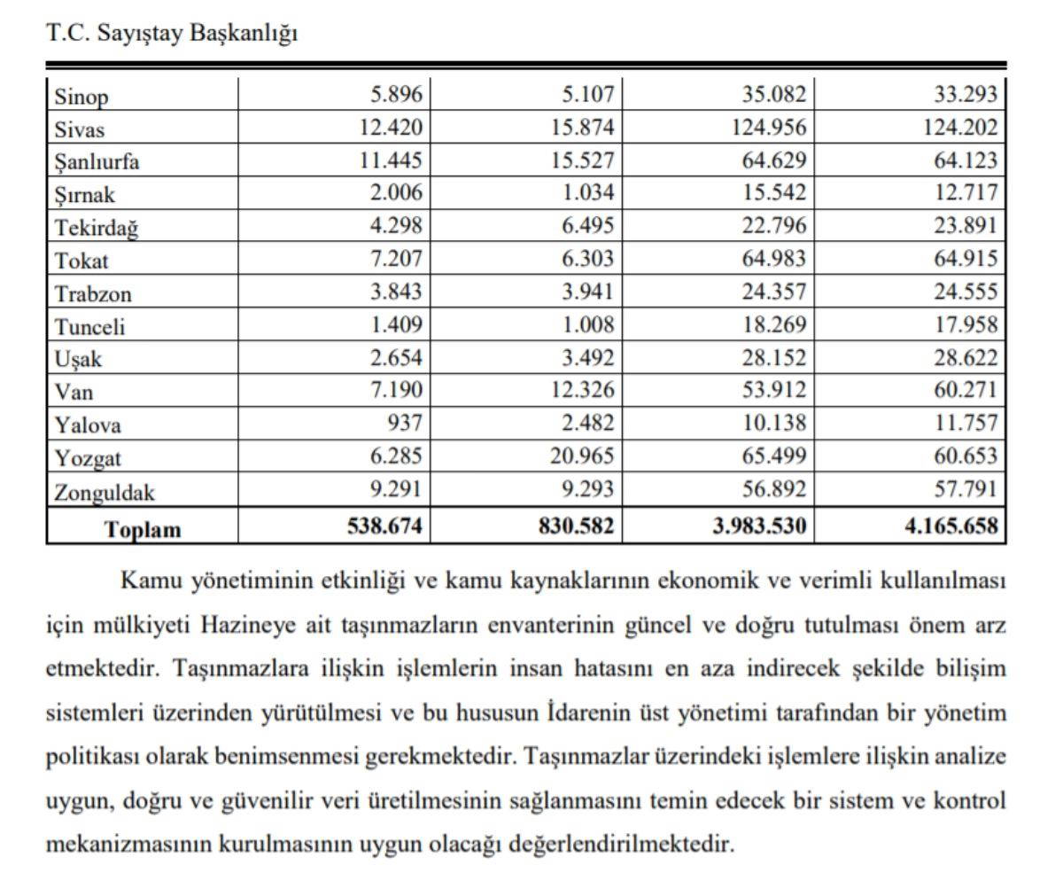 Tekin, raporda, kamu taşınmazlarının kaydedilmediği veya kayıt işlemlerinin usul ve esaslara aykırı olduğunu belirterek, taşınmaz kayıtlarının mevzuat hükümlerine uygun tutulmamasının, kamu idarelerinin mülkiyetinde bulunan taşınmaz miktarlarının tespit ve takibini de imkânsız kılındığına dikkat çekti.