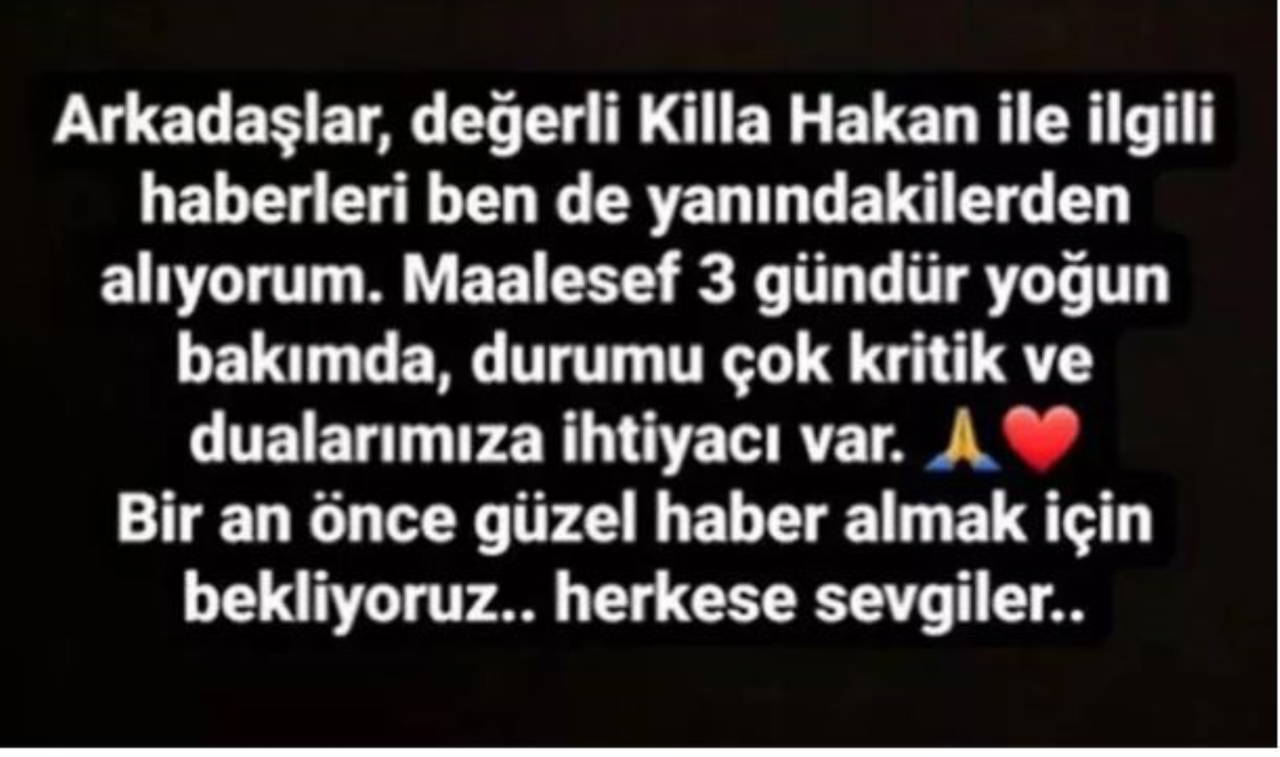 Ünlü isim, daha sonra Killa Hakan'ın hayranlarına uyarıda bulunmuş ve "Ortalıkta dönen yanlış bilgilere, başka yerlerden duyduklarınıza itibar etmeyin. Bizim dışımızda açıklama yapanları ciddiye almayın. Gelişme olduğunda sizi habersiz bırakmayacağız, dualarınızı bekliyoruz" demişti.