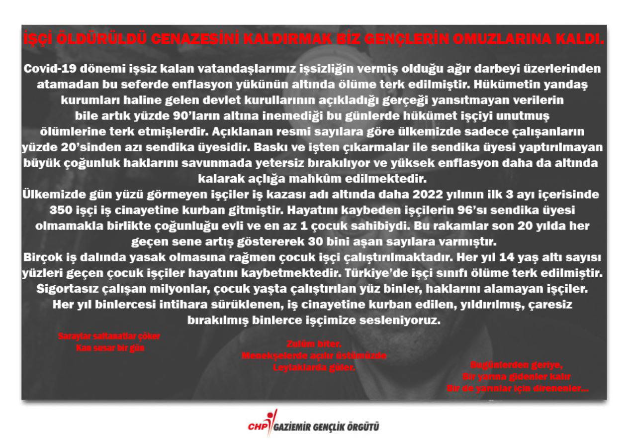 CHP Gaziemir Gençlik Örgütünün tabutlarının üzerine asmış oldukları ve sonrasında yurttaşlara dağıttıkları bildiri de şu ifadleri kullandılar: