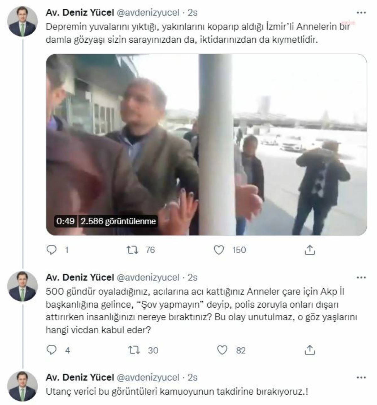 "Depremin yuvalarını yıktığı, yakınlarını koparıp aldığı İzmirli annelerin bir damla gözyaşı sizin sarayınızdan da, iktidarınızdan da kıymetlidir. 500 gündür oyaladığınız, acılarına acı kattığınız Anneler çare için AKP İl başkanlığına gelince, 'Şov yapmayın' deyip, polis zoruyla onları dışarı attırırken insanlığınızı nereye bıraktınız? Bu olay unutulmaz, o göz yaşlarını hangi vicdan kabul eder? Utanç verici bu görüntüleri kamuoyunun takdirine bırakıyoruz".