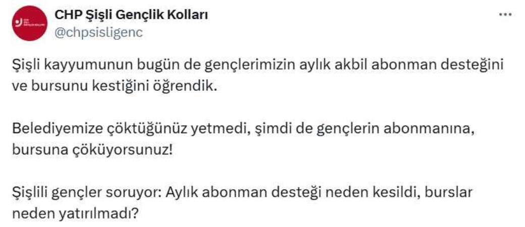 CHP Şişli Gençlik Kolları'ndan yapılan açıklamada, "Şişli kayyumunun bugün de gençlerimizin aylık akbil abonman desteğini ve bursunu kestiğini öğrendik. Belediyemize çöktüğünüz yetmedi, şimdi de gençlerin abonmanına, bursuna çöküyorsunuz!