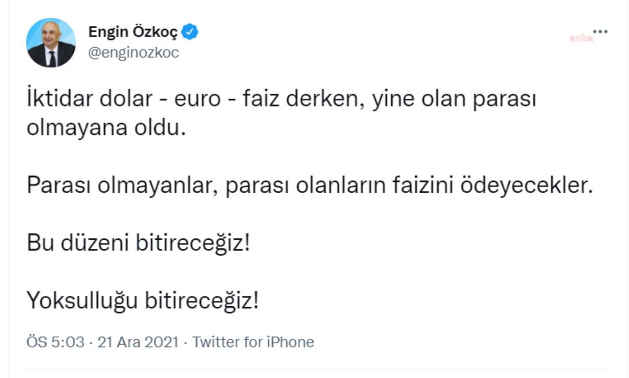 “İktidar dolar-euro- faiz derken, yine olan parası olmayana oldu. Parası olmayanlar, parası olanların faizini ödeyecekler. Bu düzeni bitireceğiz! Yoksulluğu bitireceğiz!”
