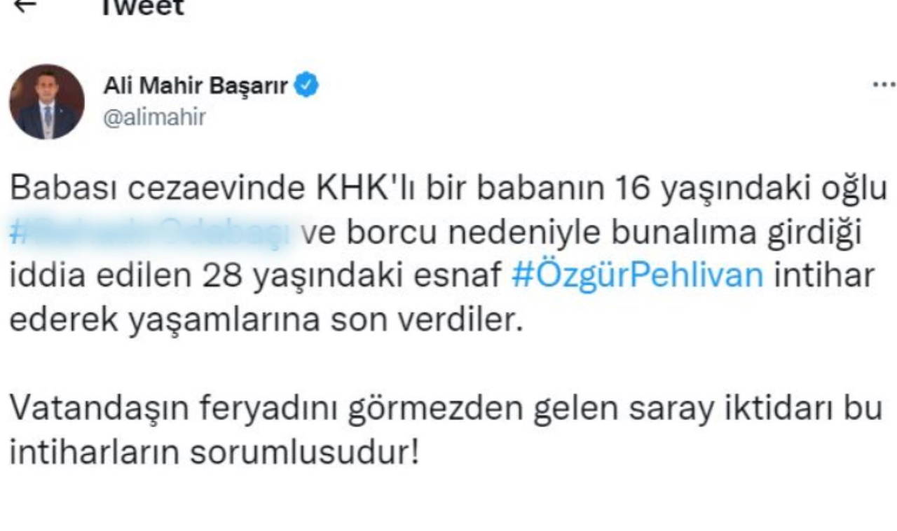 Başarır, paylaşımının sonunda ise "Vatandaşın feryadını görmezden gelen saray iktidarı bu intiharların sorumlusudur!" ifadelerini kullandı.