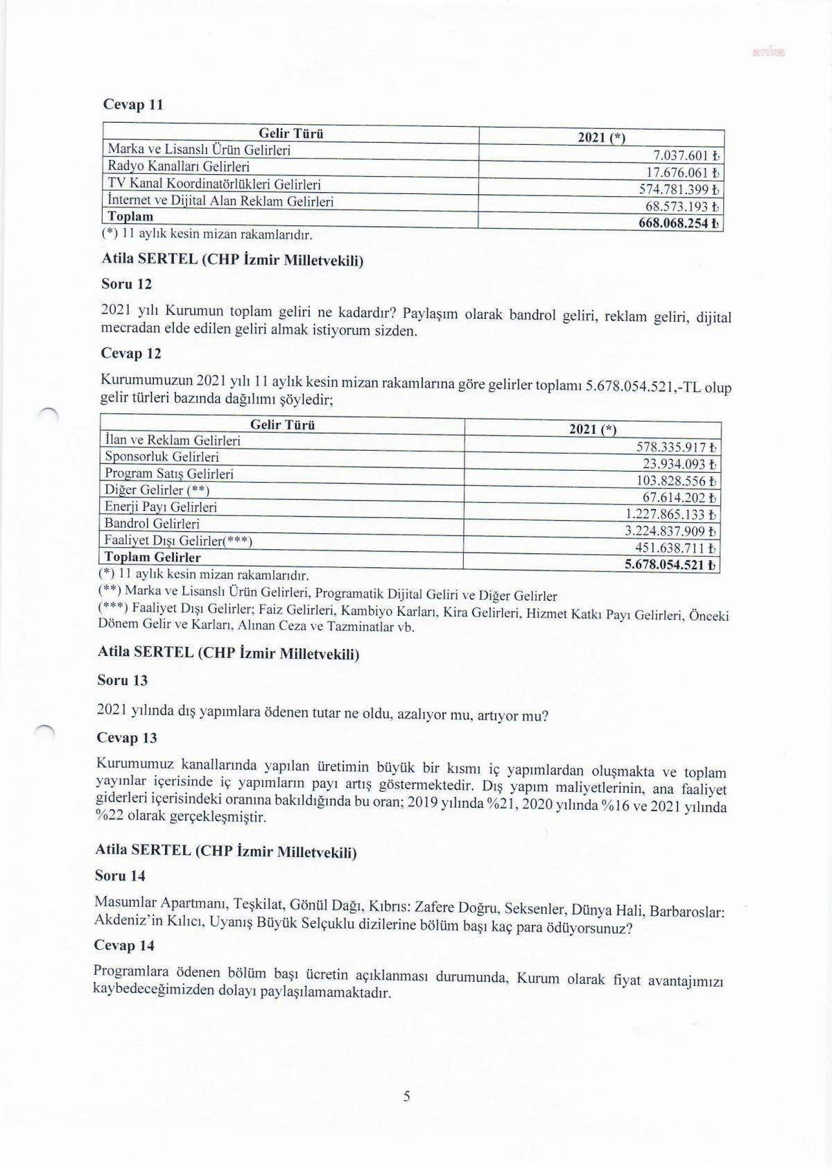 TRT’nin 2021 yılı gelirlerine ilişkin sorusunun yanıt bulduğunu aktaran Atila Sertel, kurumun 2021 yılı 11 aylık gelirinin 5 milyar 678 milyon 54 bin 521 TL olarak gerçekleştiğini belirterek şunları söyledi: