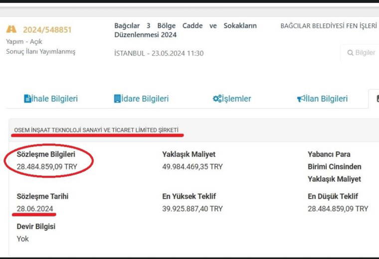 Söz konusu firmanın, 2019-2022 yılları arasında da o dönem AKP tarafından yönetilen Tuzla Belediyesi’nden, çoğunluğu kaldırım işi olmak üzere 6 ihale aldığı öğrenildi. 31 Mart Yerel Seçimleri’nde Tuzla Belediyesi’nin CHP’ye geçmesinden sonra Kütahya İl Özel İdaresi’nden de bir ihale alan Osem, çıkışını geçen yıl Bağcılar Belediyesi’nden aldığı 28 milyon TL’lik ihaleyle yakaladı. Firma, geçen yıl düzenlenen ihalenin hemen ardından Bağcılar Belediyesi’nden yeni bir ihale daha aldı.