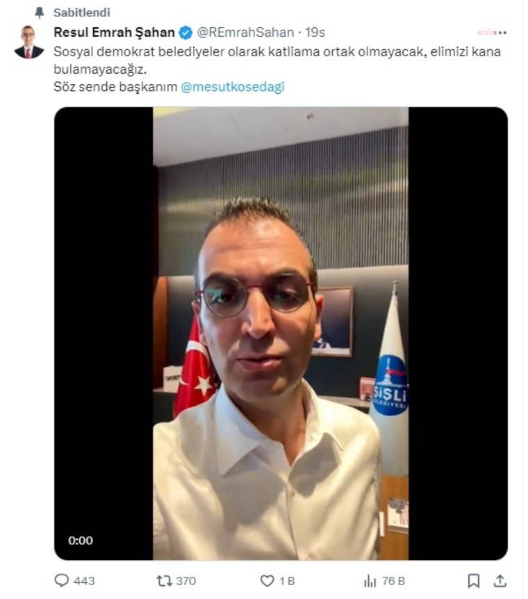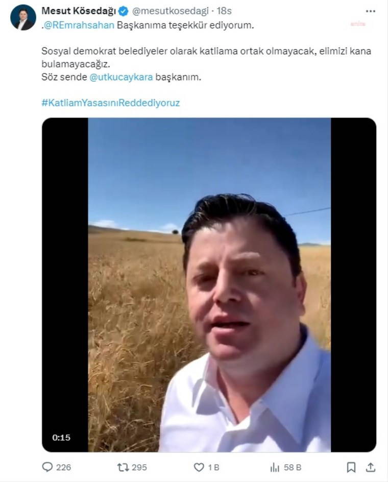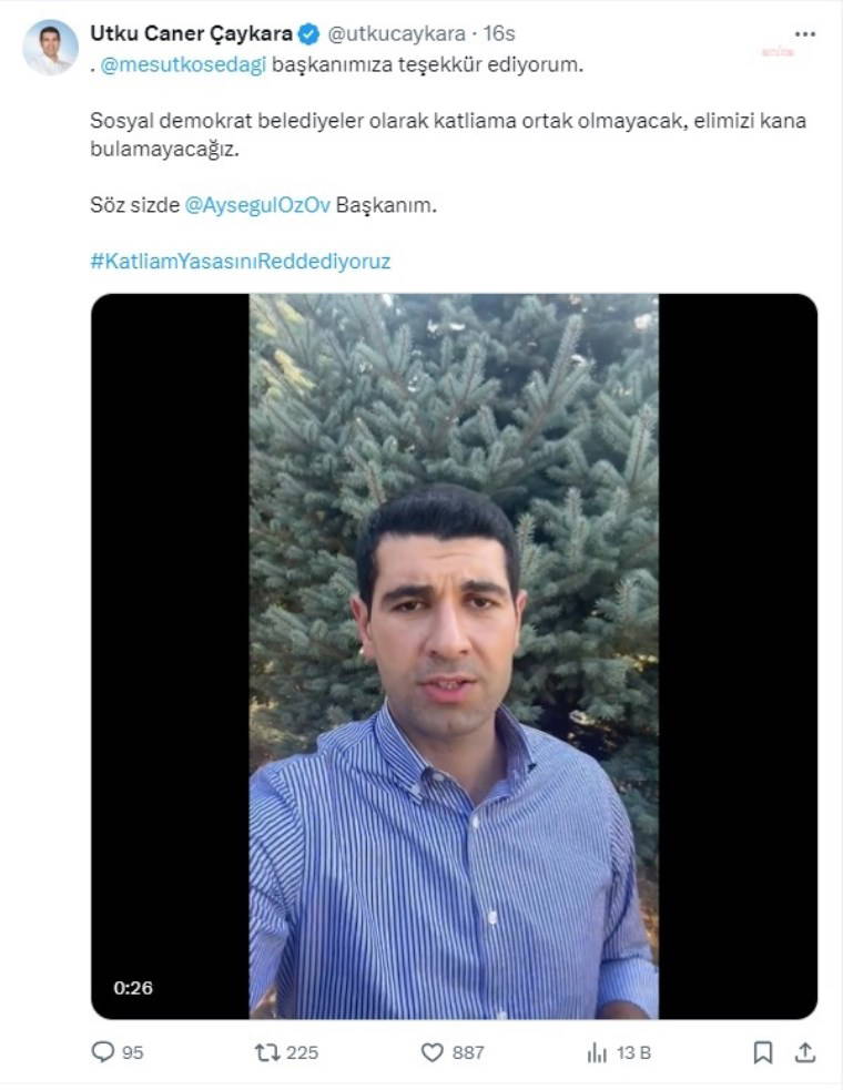 Kösedağı’nın paylaşımı üzerine Çaykara, “Sosyal demokrat belediyeler olarak katliama ortak olmayacak, elimizi kana bulamayacağız” diyerek Bakırköy Belediye Başkanı Ayşegül Ovalıoğlu’na sözü bıraktı.