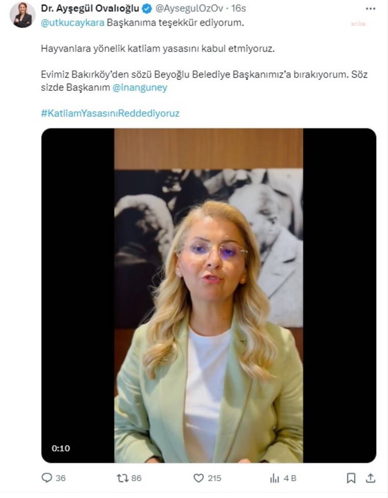 Bakırköy Belediye Başkanı Ayşegül Ovalıoğlu da “Utku Caner Çaykara Başkanıma teşekkür ediyorum. Hayvanlara yönelik katliam yasasını kabul etmiyoruz. Evimiz Bakırköy’den sözü Beyoğlu Belediye Başkanımız’a bırakıyorum” diyerek İnan Güney’e seslendi.