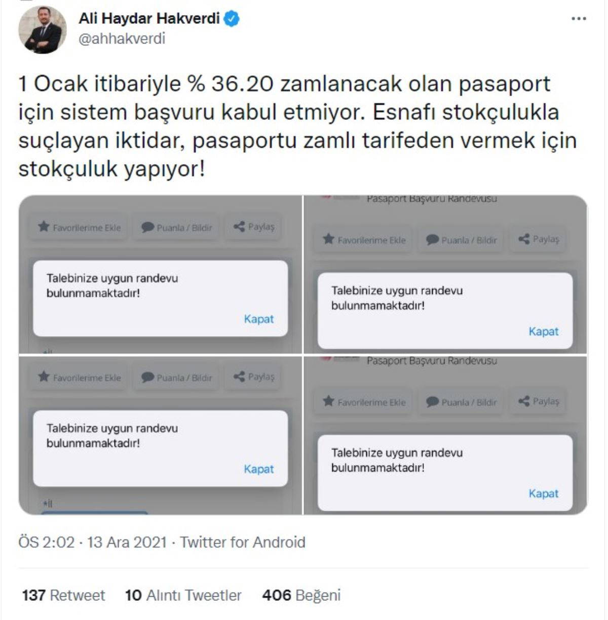 Ali Haydar Hakverdi, mesajında, "1 Ocak itibarıyla yüzde 36.20 zamlanacak olan pasaport için sistem başvuru kabul etmiyor. Esnafı stokçulukla suçlayan iktidar, pasaportu zamlı tarifeden vermek için stokçuluk yapıyor!" ifadelerine yer verdi.