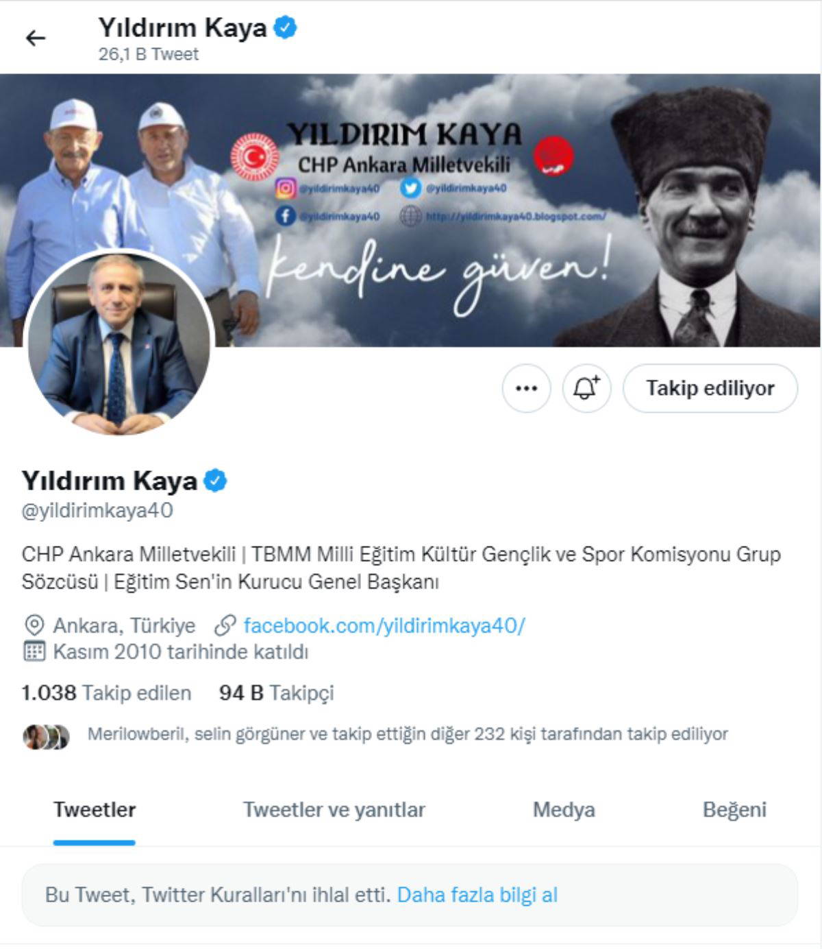 Kaya'nın Twitter hesabına girildiğinde paylaşımda "Bu tweet, Twitter Kuralları'nı ihlal etti" yazısı yer alıyor.