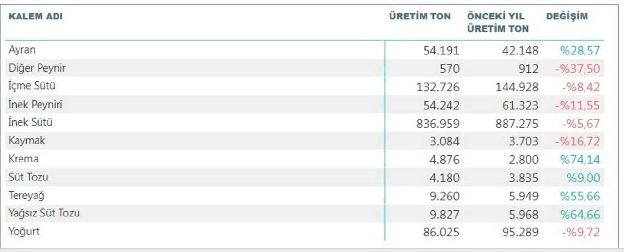Ürün gruplarının önceki yıla göre üretim miktarlarındaki değişimi gösteren tabloyu paylaşan Karabat, şu ifadeleri kullandı: